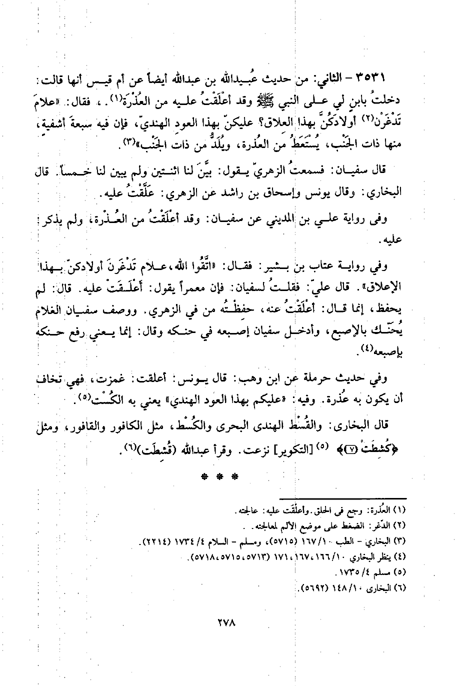 3531 - الثَّانِي: من حَدِيث عبيد الله بن عبد الله أَيْضا عَن أم قيس أَنَّهَا قَالَت: دخلت بابنٍ لي على النَّبِي صلى الله عَلَيْهِ وَسلم وَقد أعلقت عَلَيْهِ من الْعذرَة.، فَقَالَ: " علام تدغرن أَوْلَادكُنَّ بِهَذَا العلاق؟ عليكن بِهَذَا الْعود الْهِنْدِيّ، فَإِن فِيهِ سَبْعَة أشفيةٍ، مِنْهَا ذَات الْجنب، يستعط من الْعذرَة، ويلد من ذَات الْجنب ".