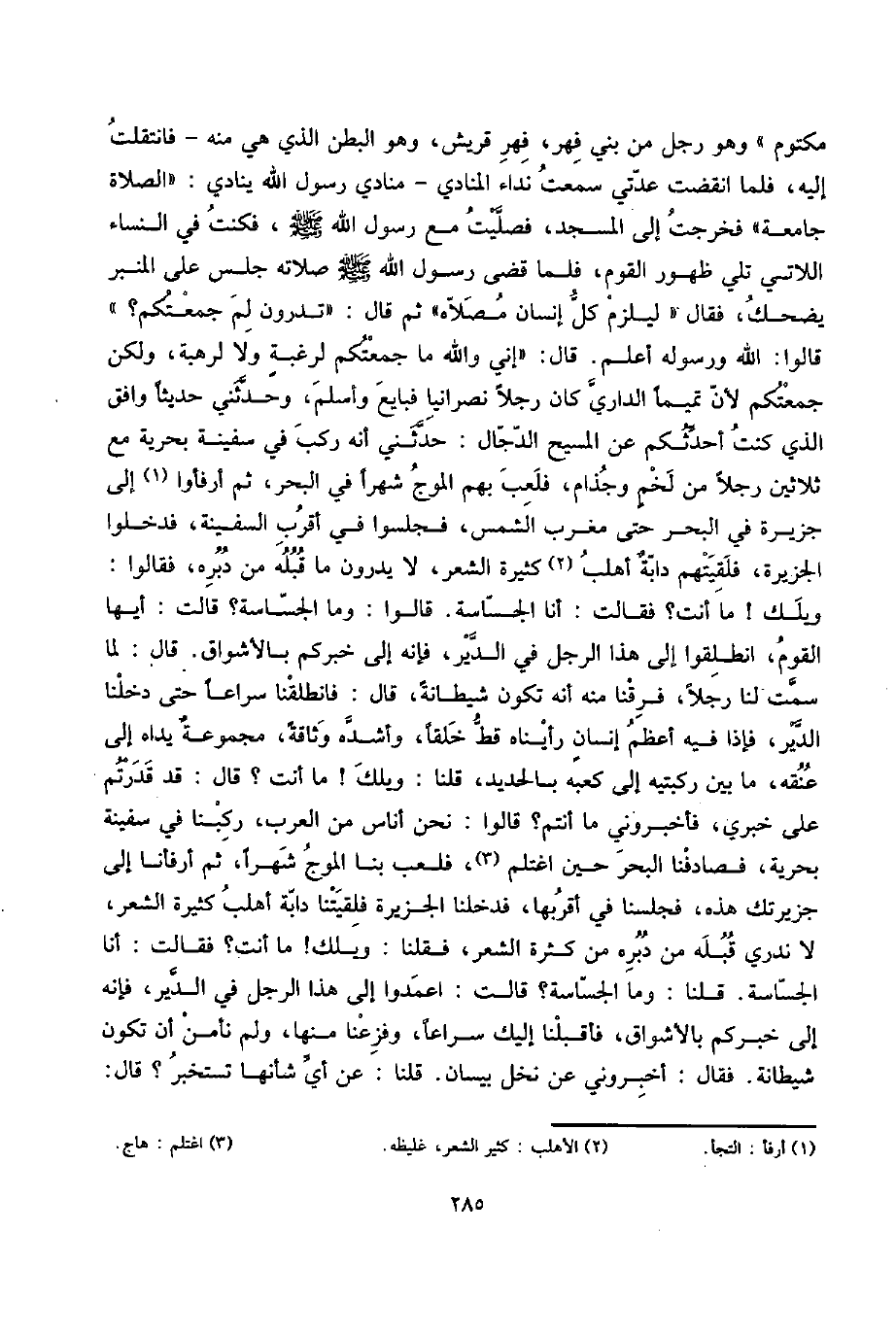 مَكْتُوم " وَهُوَ رجل من بني فهر، فهر قُرَيْش، وَهُوَ الْبَطن الَّذِي هِيَ مِنْهُ - فانتقلت إِلَيْهِ، فَلَمَّا انْقَضتْ عدتي سَمِعت نِدَاء الْمُنَادِي - مُنَادِي رَسُول الله يُنَادي: " الصَّلَاة جَامِعَة " فَخرجت إِلَى الْمَسْجِد، فَصليت مَعَ رَسُول الله صلى الله عَلَيْهِ وَسلم، فَكنت فِي النِّسَاء اللَّاتِي تلِي ظُهُور الْقَوْم، فَلَمَّا قضى رَسُول الله صلى الله عَلَيْهِ وَسلم صلَاته جلس على الْمِنْبَر يضْحك، فَقَالَ " ليلزم كل إِنْسَان مُصَلَّاهُ " ثمَّ قَالَ: " تَدْرُونَ لم جمعتكم؟ " قَالُوا: الله وَرَسُوله أعلم. قَالَ: " إِنِّي وَالله مَا جمعتكم لرغبةٍ وَلَا لرهبة، وَلَكِن جمعتكم لِأَن تميماً الدَّارِيّ كَانَ رجلا نَصْرَانِيّا فَبَايع وَأسلم، وحَدثني حَدِيثا وَافق الَّذِي كنت أحدثكُم عَن الْمَسِيح الدَّجَّال: حَدثنِي أَنه ركب فِي سفينة بحريّة مَعَ ثَلَاثِينَ رجلا من لخمٍ وجذام، فلعب بهم الموج شهرا فِي الْبَحْر، ثمَّ أرفأوا إِلَى جَزِيرَة فِي الْبَحْر حَتَّى مغرب الشَّمْس، فجلسوا فِي أقرب السَّفِينَة، فَدَخَلُوا الجزيرة، فلقيتهم دابةٌ أهلب كَثِيرَة الشّعْر، لَا يَدْرُونَ مَا قبله من دبره، فَقَالُوا: وَيلك {مَا أَنْت؟ فَقَالَت: أَنا الْجَسَّاسَة. قَالُوا: وَمَا الْجَسَّاسَة؟ قَالَت: أَيهَا الْقَوْم، انْطَلقُوا إِلَى هَذَا الرجل فِي الدَّيْر، فَإِنَّهُ إِلَى خبركم بالأشواق. قَالَ: لما سمت لنا رجلا، فرقنا مِنْهُ أَنه تكون شَيْطَانَة، قَالَ: فَانْطَلَقْنَا سرَاعًا حَتَّى دَخَلنَا الدَّيْر، فَإِذا فِيهِ أعظم إنسانٍ رَأَيْنَاهُ قطّ خلقا، وأشده وثاقةً، مجموعةٌ يَدَاهُ إِلَى عُنُقه، مَا بَين رُكْبَتَيْهِ إِلَى كَعبه بالحديد، قُلْنَا: وَيلك} مَا أَنْت؟ قَالَ: قد قدرتم على خبري، فَأَخْبرُونِي مَا أَنْتُم؟ قَالُوا: نَحن أنَاس من الْعَرَب، ركبنَا فِي سفينة بحريّة، فصادفنا الْبَحْر حِين اغتلم، فلعب بِنَا الموج شهرا، ثمَّ أرفأنا إِلَى جزيرتك هَذِه، فَجَلَسْنَا فِي أقربها، فَدَخَلْنَا الجزيرة فلقيتنا دَابَّة أهلب كَثِيرَة الشّعْر، لَا نَدْرِي قبله من دبره من كَثْرَة الشّعْر، فَقُلْنَا: وَيلك! مَا أَنْت؟ فَقَالَت: أَنا الْجَسَّاسَة. قُلْنَا: وَمَا الْجَسَّاسَة؟ قَالَت: اعمدوا إِلَى هَذَا الرجل فِي الدَّيْر، فَإِنَّهُ إِلَى خبركم بالأشواق، فأقبلنا إِلَيْك سرَاعًا، وفزعنا مِنْهَا، وَلم نَأْمَن أَن تكون شَيْطَانَة. فَقَالَ: أخبروني عَن نخل بيسان. قُلْنَا: عَن أَي شَأْنهَا تستخبر؟ قَالَ: