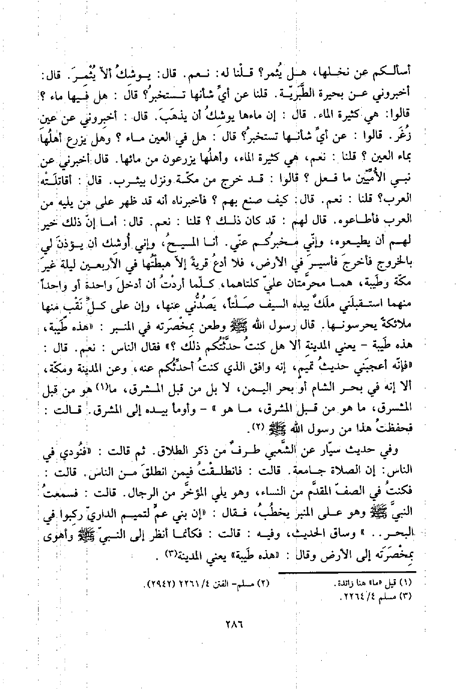أَسأَلكُم عَن نخلها، هَل يُثمر؟ قُلْنَا لَهُ: نعم، قَالَ: يُوشك أَلا يُثمر. قَالَ: أخبروني عَن بحيرة الطبرية. قُلْنَا عَن أَي شَأْنهَا تستخبر؟ قَالَ: هَل فِيهَا مَاء؟ قَالُوا: هِيَ كَثِيرَة المَاء. قَالَ: إِن ماءها يُوشك أَن يذهب. قَالَ: أَخْبرنِي عَن عين زغر. قَالُوا: عَن أَي شَأْنهَا تستخبر؟ قَالَ: هَل فِي الْعين مَاء؟ وَهل يزرع أَهلهَا بِمَاء الْعين؟ قُلْنَا: نعم، هِيَ كَثِيرَة المَاء، وَأَهْلهَا يزرعون من مَائِهَا. قَالَ أَخْبرنِي عَن نَبِي الْأُمِّيين مَا فعل؟ قَالُوا: قد خرج من مَكَّة وَنزل بِيَثْرِب. قَالَ: أقاتلته الْعَرَب؟ قُلْنَا: نعم. قَالَ: كَيفَ صنع بهم؟ فَأَخْبَرنَاهُ أَنه قد ظهر على من يَلِيهِ من الْعَرَب فأطاعوه. قَالَ لَهُم: قد كَانَ ذَلِك؟ قُلْنَا: نعم. قَالَ: أما إِن ذَلِك خير لَهُم أَن يطيعوه، وَإِنِّي مخبركم عني. أَنا الْمَسِيح، وَإِنِّي أوشك أَن يُؤذن لي بِالْخرُوجِ فَأخْرج فأسير فِي الأَرْض، فَلَا أدع قَرْيَة إِلَّا هبطتها فِي الْأَرْبَعين لَيْلَة غير مَكَّة وطيبة، هما محرمتان عَليّ كلتاهما، كلما أردْت أَن أَدخل وَاحِدَة أَو وَاحِدًا مِنْهُمَا استقبلني ملكٌ بِيَدِهِ السَّيْف صَلتا، يصدني عَنْهَا، وَإِن على كل نقبٍ مِنْهَا مَلَائِكَة يحرسونها. قَالَ رَسُول الله صلى الله عَلَيْهِ وَسلم وَطعن بمخصرته فِي الْمِنْبَر: " هَذِه طيبَة، هَذِه طيبَة - يَعْنِي الْمَدِينَة أَلا هَل كنت حدثتكم ذَلِك؟ " فَقَالَ النَّاس: نعم. قَالَ: " فَإِنَّهُ أعجبني حَدِيث تميمٍ، إِنَّه وَافق الَّذِي كنت أحدثكُم عَنهُ، وَعَن الْمَدِينَة وَمَكَّة، أَلا إِنَّه فِي بَحر الشَّام أَو بَحر الْيمن، لَا بل من قبل الْمشرق، مَا هُوَ من قبل الْمشرق، مَا هُوَ من قبل الْمشرق، مَا هُوَ " - وَأَوْمَأَ بِيَدِهِ إِلَى الْمشرق. قَالَت: فَحفِظت هَذَا من رَسُول الله صلى الله عَلَيْهِ وَسلم.