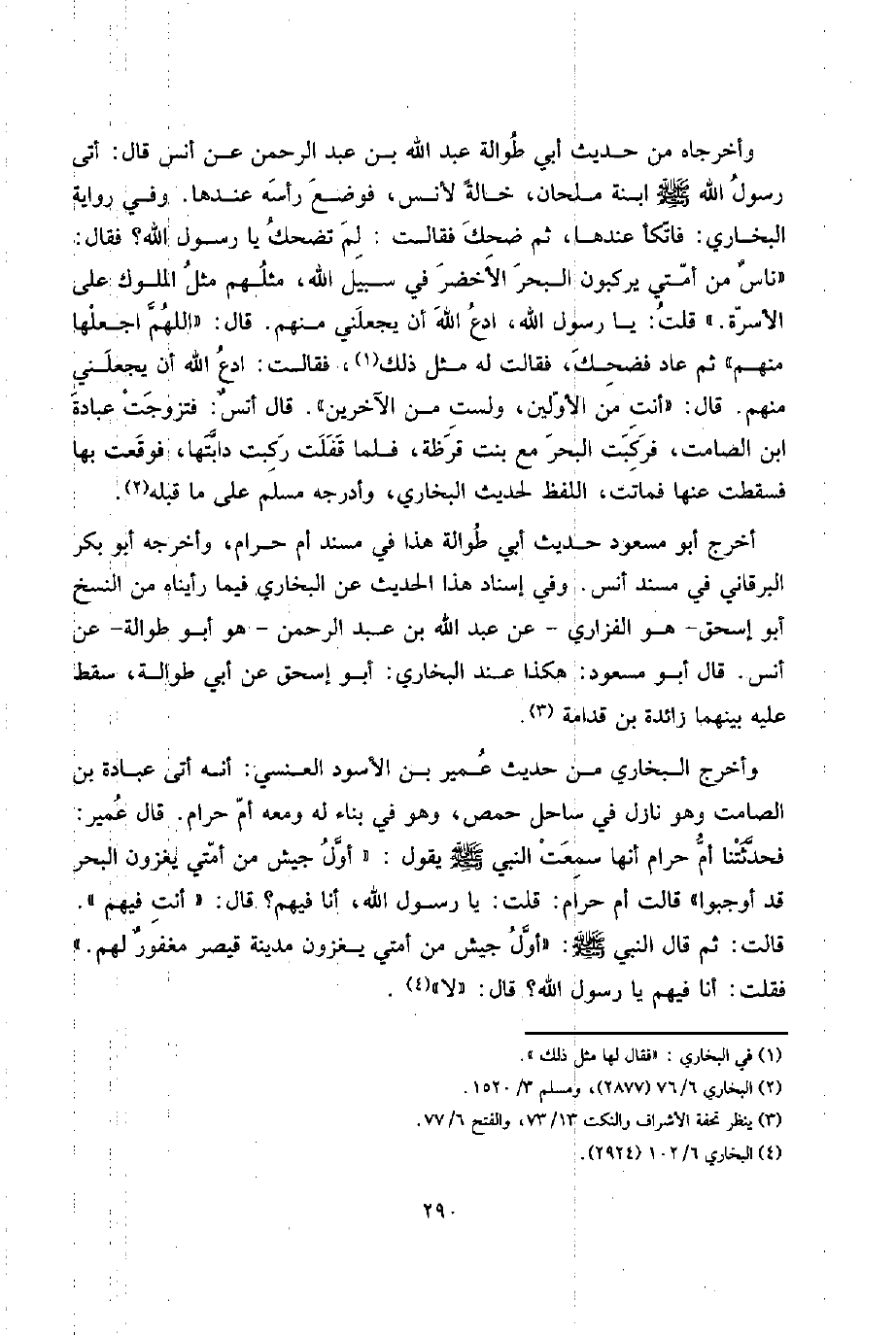 أَتَى رَسُول الله صلى الله عَلَيْهِ وَسلم ابْنة ملْحَان، خَالَة لأنس، فَوضع رَأسه عِنْدهَا. وَفِي رِوَايَة البُخَارِيّ: فاتكأ عِنْدهَا، ثمَّ ضحك فَقَالَت: لم تضحك يَا رَسُول الله؟ فَقَالَ: " ناسٌ من أمتِي يركبون الْبَحْر الْأَخْضَر فِي سَبِيل الله، مثلهم مثل الْمُلُوك على الأسرة. قلت: يَا رَسُول الله، ادْع الله أَن يَجْعَلنِي مِنْهُم. قَالَ: " اللَّهُمَّ اجْعَلْهَا مِنْهُم " ثمَّ عَاد فَضَحِك، فَقَالَت لَهُ مثل ذَلِك، فَقَالَت: ادْع الله أَن يَجْعَلنِي مِنْهُم. قَالَ: " أَنْت من الْأَوَّلين، وَلست من الآخرين ". قَالَ أنسٌ. فَتزوّجت عبَادَة ابْن الصَّامِت، فركبت الْبَحْر مَعَ بنت قرظة، فَلَمَّا قفلت ركبت دابتها، فَوَقَعت بهَا فَسَقَطت عَنْهَا فَمَاتَتْ، اللَّفْظ لحَدِيث البُخَارِيّ، وأدرجه مُسلم على مَا قبله.