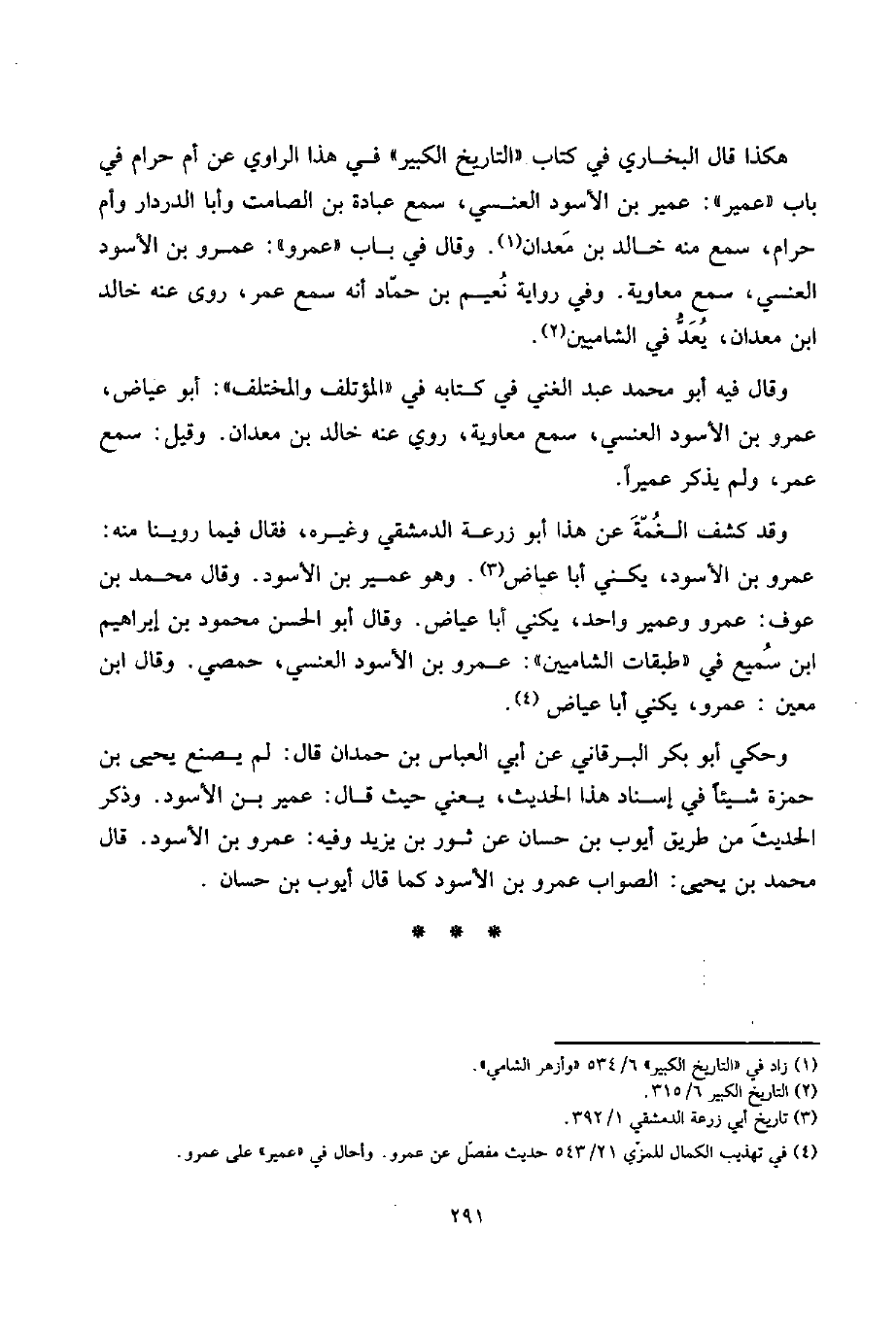 هَكَذَا قَالَ البُخَارِيّ فِي كتاب " التَّارِيخ الْكَبِير " فِي هَذَا الرَّاوِي عَن أم حرَام فِي بَاب " عُمَيْر ": عُمَيْر بن الْأسود الْعَنسِي، سمع عبَادَة بن الصَّامِت وابا الدردار وَأم حرَام، سمع مِنْهُ خَالِد بن معدان. وَقَالَ فِي بَاب " عَمْرو ": عَمْرو بن الْأسود الْعَنسِي، سمع مُعَاوِيَة. وَفِي رِوَايَة نعيم بن حَمَّاد أَنه سمع عمر، روى عَنهُ خَالِد ابْن معدان، يعد فِي الشاميين.