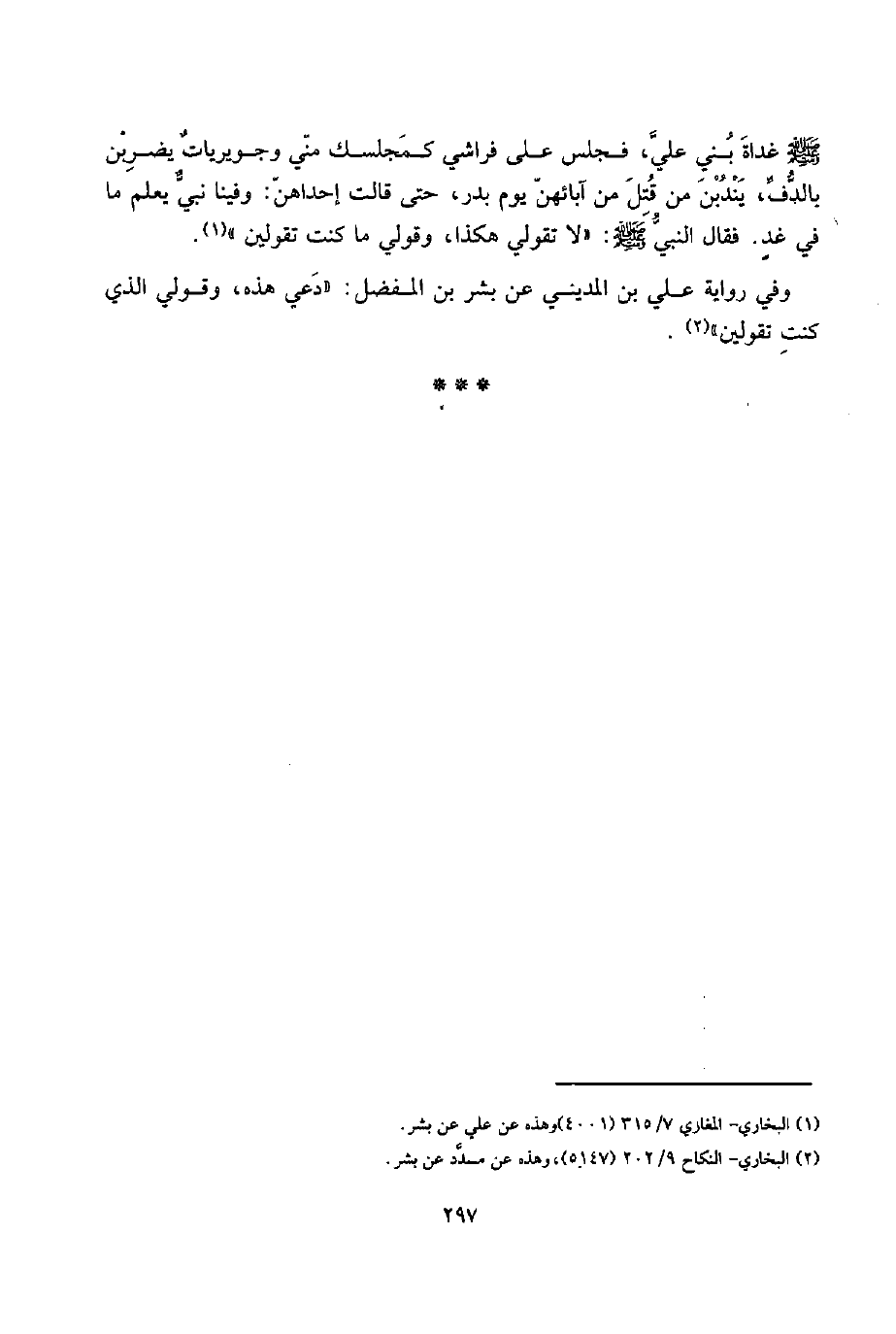 صلى الله عَلَيْهِ وَسلم غَدَاة بني عَليّ، فَجَلَسَ على فِرَاشِي كمجلسك مني وجويرياتٌ يضربن بالدف، يندبن من قتل من آبائهن يَوْم بدر، حَتَّى قَالَت إِحْدَاهُنَّ: وَفينَا نبيٌّ يعلم مَا فِي غدٍ. فَقَالَ النَّبِي صلى الله عَلَيْهِ وَسلم: " لَا تقولي هَكَذَا، وَقَوْلِي مَا كنت تَقُولِينَ ".