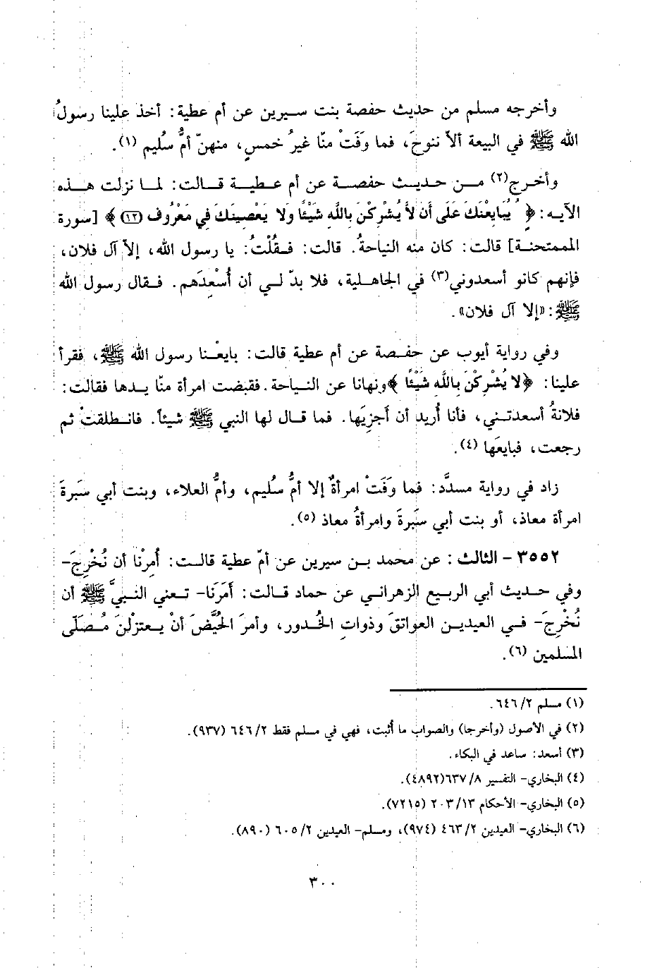3552 - الثَّالِث: عَن مُحَمَّد بن سِيرِين عَن أم عَطِيَّة قَالَت: أمرنَا أَن نخرج - وَفِي حَدِيث أبي الرّبيع الزهْرَانِي عَن حَمَّاد قَالَت: أمرنَا - تَعْنِي النَّبِي صلى الله عَلَيْهِ وَسلم أَن نخرج - فِي الْعِيدَيْنِ الْعَوَاتِق وَذَوَات الْخُدُور، وَأمر الْحيض أَن يعتزلن مصلى الْمُسلمين.