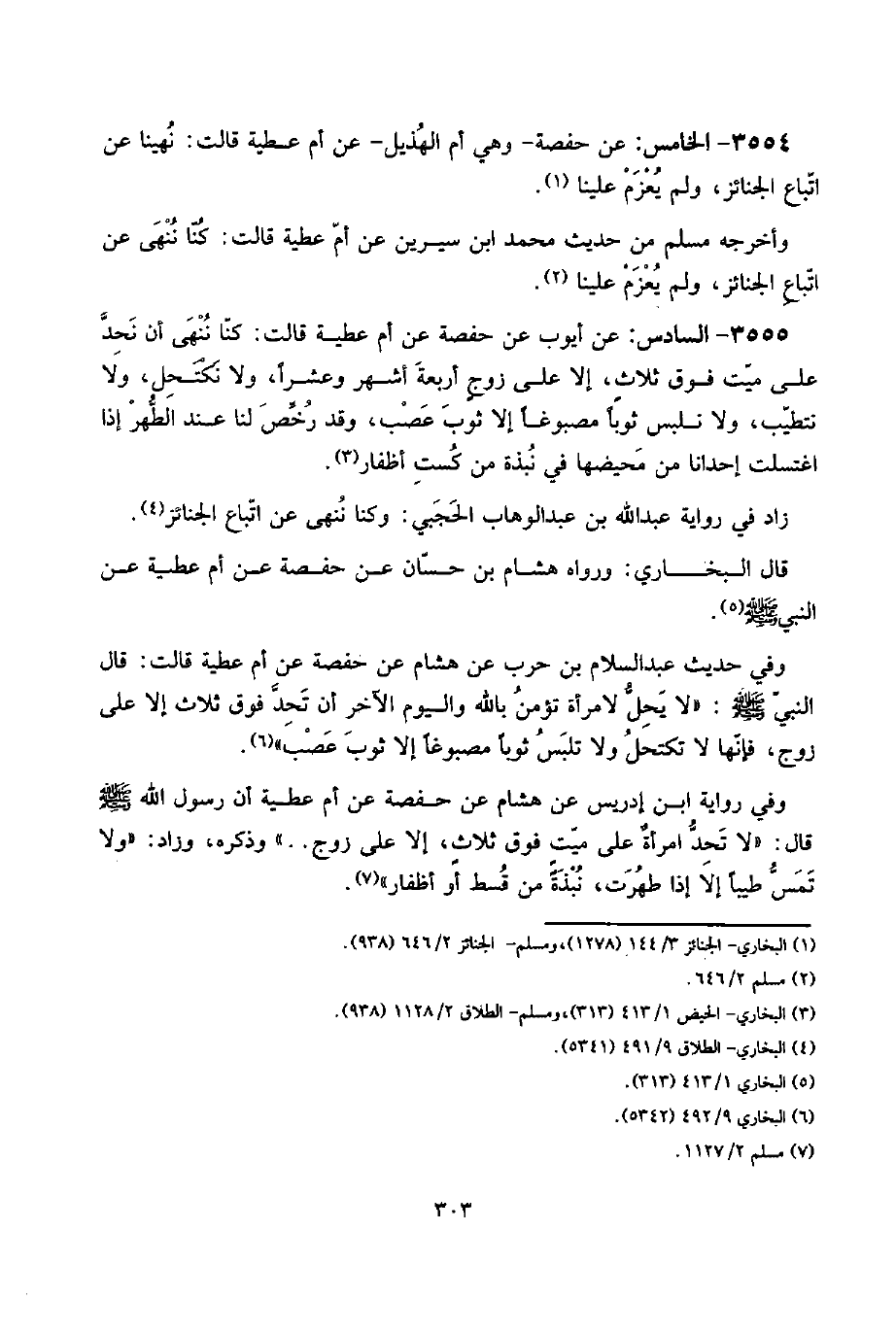 3555 - السَّادِس: عَن أَيُّوب عَن حَفْصَة عَن أم عَطِيَّة قَالَت: كُنَّا ننهى أَن نحد على ميت فَوق ثَلَاث، إِلَّا على زوجٍ أَرْبَعَة أشهر وَعشرا، وَلَا نكتحل، وَلَا نتطيب، وَلَا نلبس ثوبا مصبوغاً إِلَّا ثوب عصب، وَقد رخص لنا عِنْد الطُّهْر إِذا اغْتَسَلت إحدانا من محيضها فِي نبذة من كست أظفار.