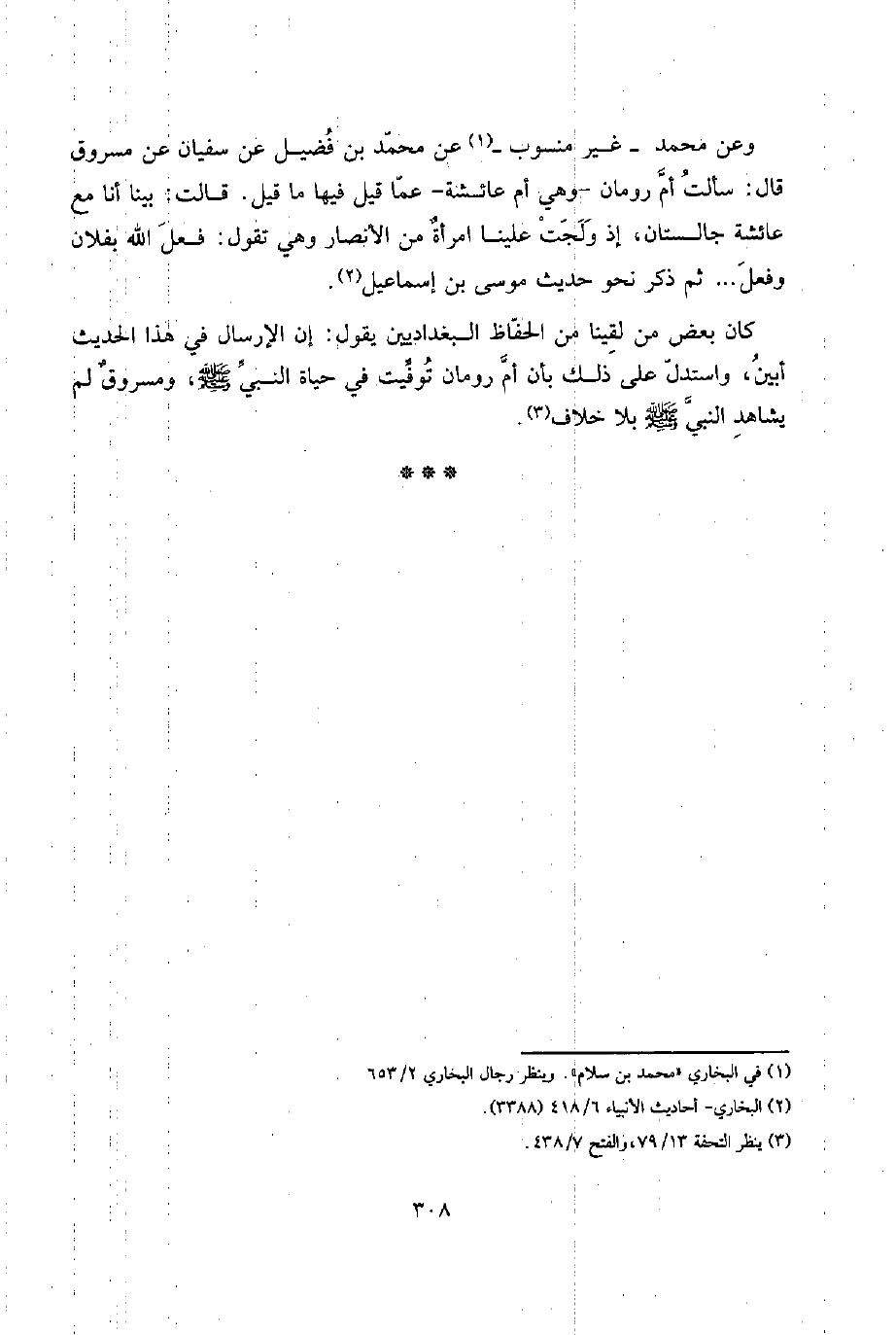 إِن الْإِرْسَال فِي هَذَا الحَدِيث أبين، وَاسْتدلَّ على ذَلِك بِأَن أم رُومَان توفيت فِي حَيَاة النَّبِي صلى الله عَلَيْهِ وَسلم، ومسروقٌ لم يُشَاهد النَّبِي صلى الله عَلَيْهِ وَسلم بِلَا خلاف.