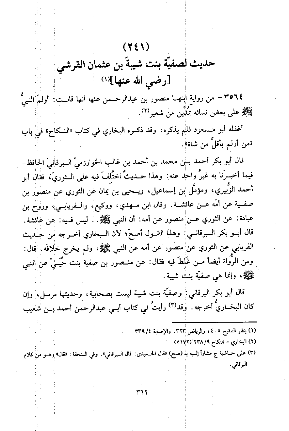 وَصفِيَّة بنت شيبَة لَيست بصحابية، وحديثها مُرْسل، وَإِن كَانَ البُخَارِيّ أخرجه. وَقد رَأَيْت فِي كتاب أبي عبد الرَّحْمَن أَحْمد بن شُعَيْب