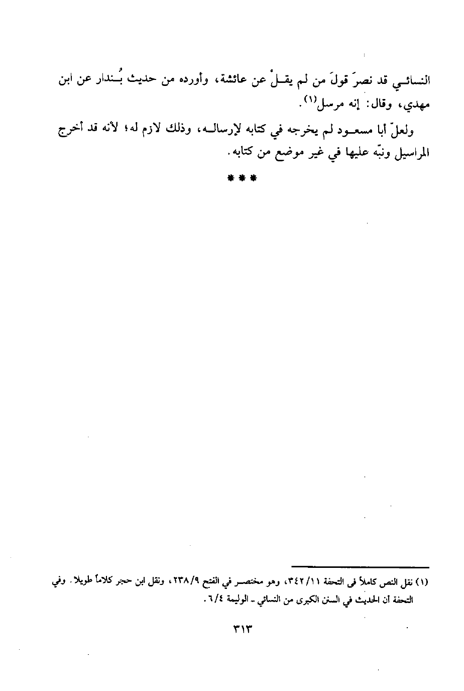 النَّسَائِيّ قد نصر قَول من لم يقل عَن عَائِشَة، وَأوردهُ من حَدِيث بنْدَار عَن ابْن مهْدي، وَقَالَ: // إِنَّه مُرْسل //.