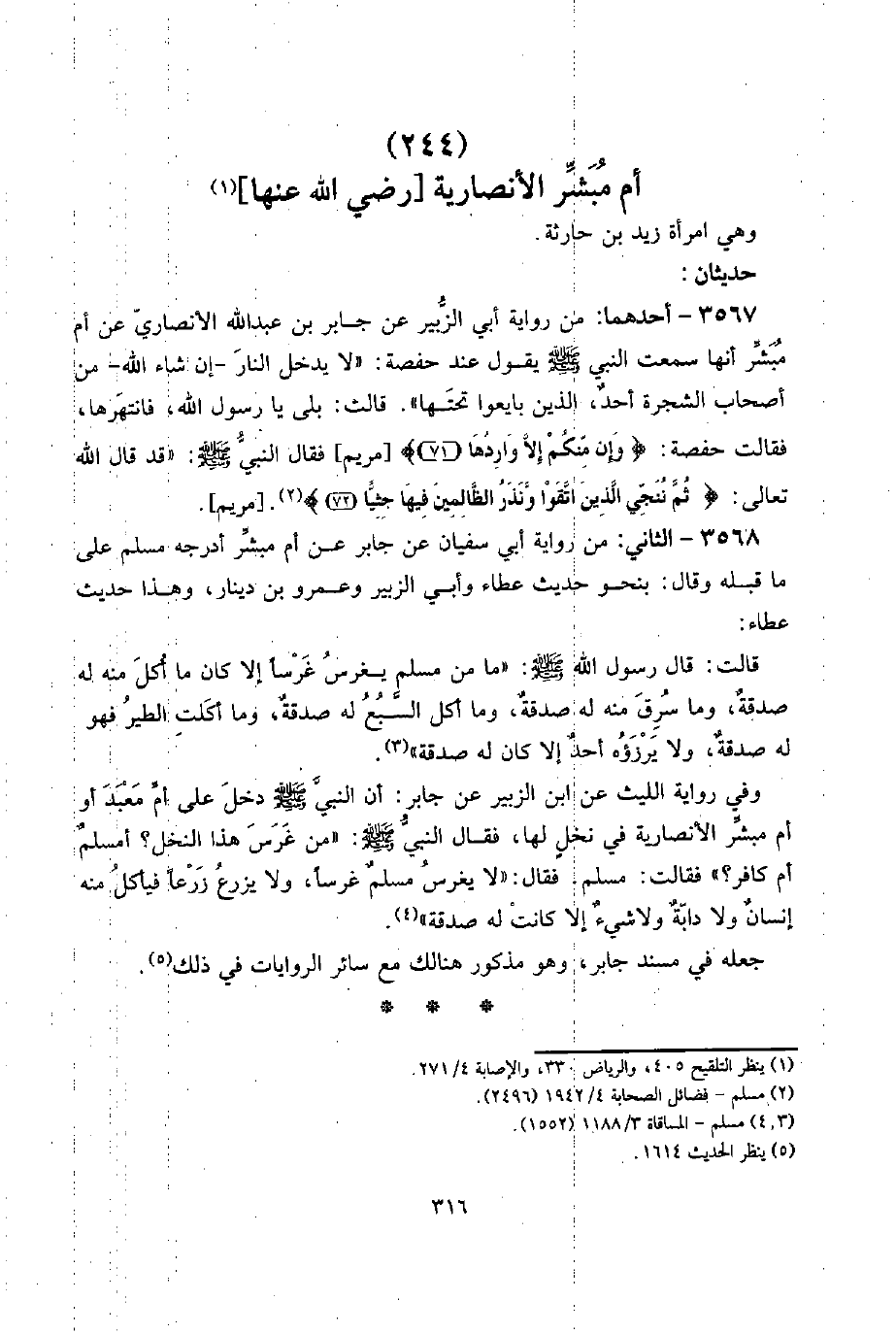3567 - أَحدهمَا: من رِوَايَة أبي الزبير عَن جَابر بن عبد الله الْأنْصَارِيّ عَن أم مُبشر أَنَّهَا سَمِعت النَّبِي صلى الله عَلَيْهِ وَسلم يَقُول عِنْد حَفْصَة: " لَا يدْخل النَّار - إِن شَاءَ الله - من أَصْحَاب الشَّجَرَة أحدٌ، الَّذين بَايعُوا تحتهَا ". قَالَت: بلَى يَا رَسُول الله، فانتهرها، فَقَالَت حَفْصَة: {وَإِن مِنْكُم إِلَّا واردها} [مَرْيَم] فَقَالَ النَّبِي صلى الله عَلَيْهِ وَسلم: " قد قَالَ الله تَعَالَى: {ثمَّ ننجي الَّذين اتَّقوا وَنذر الظَّالِمين فِيهَا جثيا} . [مَرْيَم] .