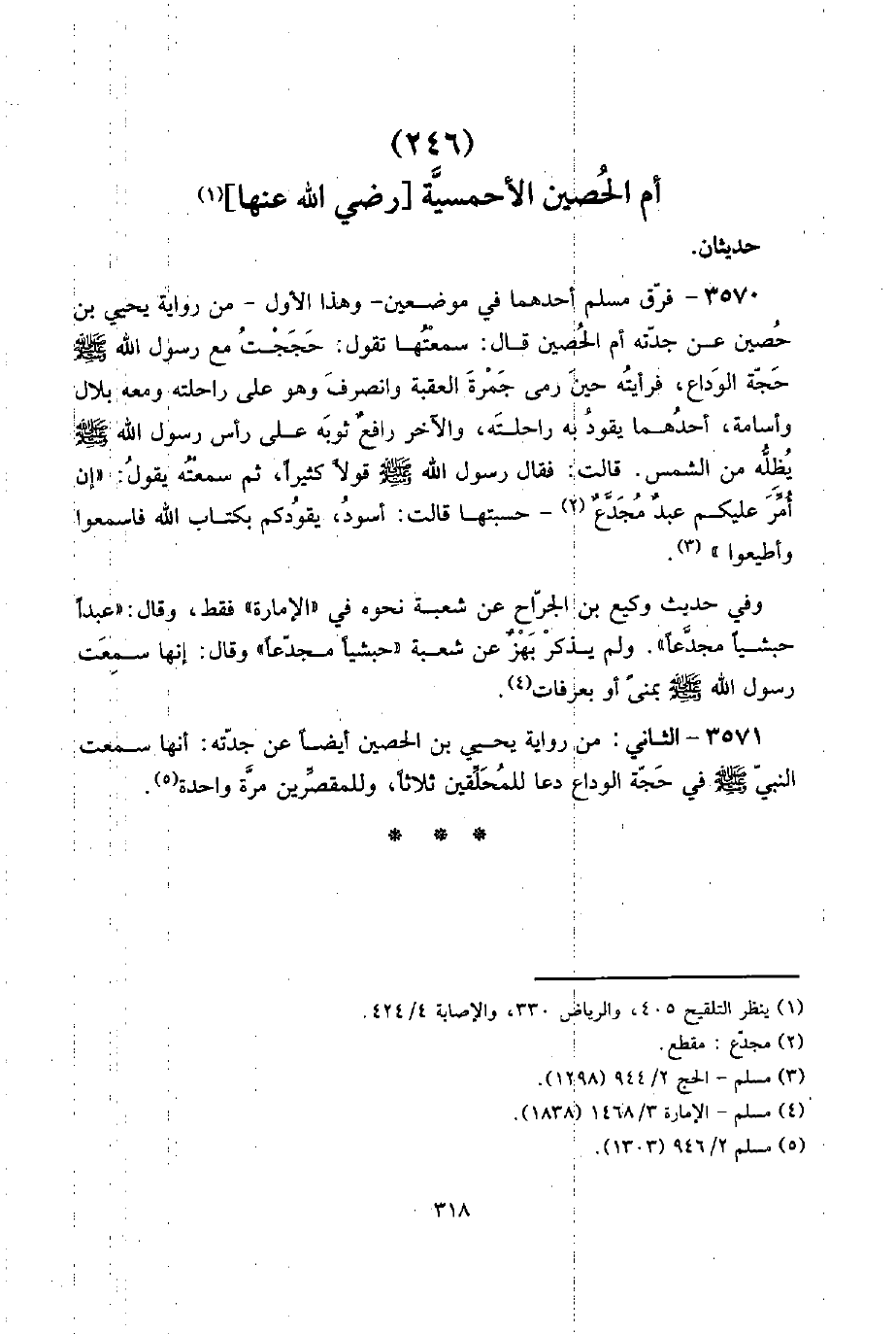 3570 - فرق مُسلم أَحدهمَا فِي موضِعين - وَهَذَا الأول - من رِوَايَة يحيى بن حُصَيْن عَن جدته أم الْحصين قَالَ: سَمعتهَا تَقول: حججْت مَعَ رَسُول الله صلى الله عَلَيْهِ وَسلم حجَّة الْوَدَاع، فرأيته حِين رمى جَمْرَة الْعقبَة وَانْصَرف وَهُوَ على رَاحِلَته وَمَعَهُ بِلَال وَأُسَامَة، أَحدهمَا يَقُود بِهِ رَاحِلَته، وَالْآخر رافعٌ ثَوْبه على رَأس رَسُول الله صلى الله عَلَيْهِ وَسلم يظله من الشَّمْس. قَالَت: فَقَالَ رَسُول الله صلى الله عَلَيْهِ وَسلم قولا كثيرا، ثمَّ سمعته يَقُول: " إِن أَمر عَلَيْكُم عبدٌ مجدعٌ - حسبتها قَالَت: أسود، يقودكم بِكِتَاب الله فَاسْمَعُوا وَأَطيعُوا ".