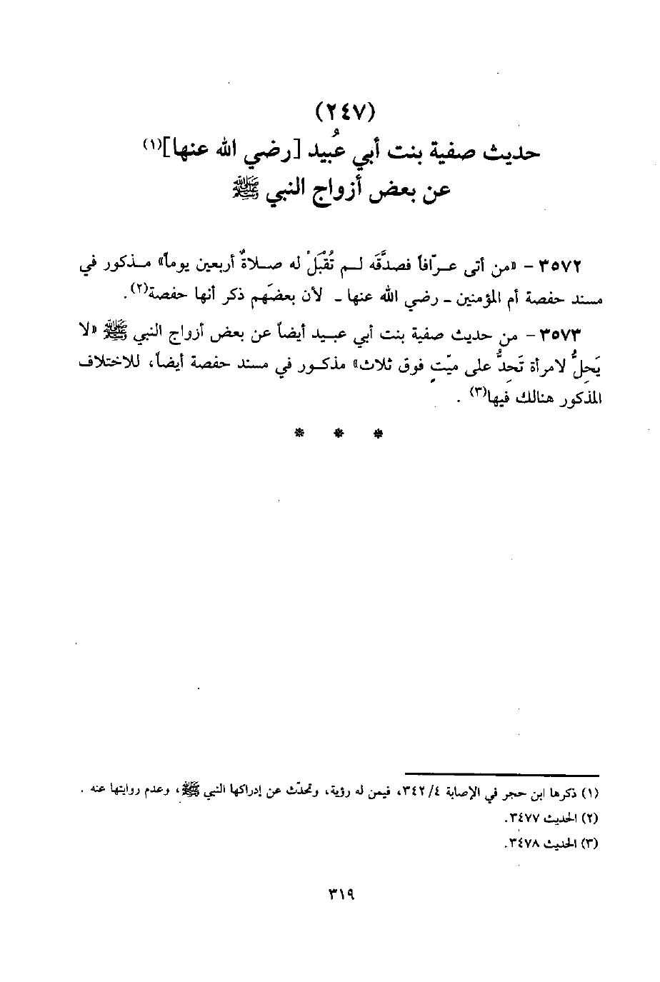 3573 - من حَدِيث صَفِيَّة بنت أبي عبيد أَيْضا عَن بعض أَزوَاج النَّبِي صلى الله عَلَيْهِ وَسلم: " لَا يحل لامْرَأَة تحد على ميتٍ فَوق ثَلَاث " مَذْكُور فِي مُسْند حَفْصَة أَيْضا، للِاخْتِلَاف الْمَذْكُور هُنَالك فِيهَا.
