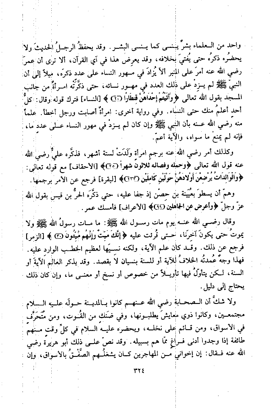 وَاحِد من الْعلمَاء بشرٌ يسنى كَمَا ينسى الْبشر. وَقد يحفظ الرجل الحَدِيث وَلَا يحضرهُ ذكره حَتَّى يُفْتِي بِخِلَافِهِ، وَقد يعرض هَذَا فِي آي الْقُرْآن، أَلا ترى أَن عمر رَضِي الله عَنهُ أَمر على الْمِنْبَر أَلا يُزَاد فِي مُهُور النِّسَاء على عدد ذكره، ميلًا إِلَى أَن النَّبِي صلى الله عَلَيْهِ وَسلم لم يزدْ على ذَلِك الْعدَد فِي مُهُور نِسَائِهِ، حَتَّى ذكرته امرأةٌ من جَانب الْمَسْجِد بقول الله تَعَالَى {وَآتَيْتُم إِحْدَاهُنَّ قِنْطَارًا} [النِّسَاء] فَترك قَوْله وَقَالَ: كل أحدٍ أعلم مِنْك حَتَّى النِّسَاء. وَفِي رِوَايَة أُخْرَى: امرأةٌ أَصَابَت وَرجل أَخطَأ. علما مِنْهُ رَضِي الله عَنهُ بِأَن النَّبِي صلى الله عَلَيْهِ وَسلم وَإِن كَانَ لم يزدْ فِي مُهُور النِّسَاء على عددٍ مَا، فَإِنَّهُ لم يمْنَع مَا سواهُ، وَالْآيَة أَعم.