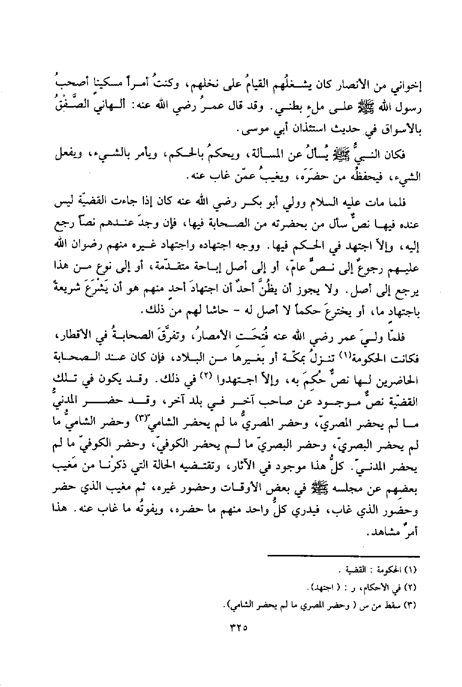 فَلَمَّا ولي عمر رَضِي الله عَنهُ فتحت الْأَمْصَار، وتفرق الصَّحَابَة فِي الأقطار، فَكَانَت الْحُكُومَة تنزل بِمَكَّة أَو بغَيْرهَا من الْبِلَاد، فَإِن كَانَ عِنْد الصَّحَابَة الْحَاضِرين لَهَا نصٌّ حكم بِهِ، وَإِلَّا اجتهدوا فِي ذَلِك. وَقد يكون فِي تِلْكَ الْقَضِيَّة نصٌّ مَوْجُود عَن صَاحب آخر فِي بلد آخر، وَقد حضر الْمدنِي مَا لم يحضر الْمصْرِيّ، وَحضر الْمصْرِيّ مَا لم يحضر الشَّامي وَحضر الشَّامي مَا لم يحضر الْبَصْرِيّ، وَحضر الْبَصْرِيّ مَا لم يحضر الْكُوفِي، وَحضر الْكُوفِي مَا لم يحضر الْمدنِي. كل هَذَا مَوْجُود فِي الْآثَار، وتقتضيه الْحَالة الَّتِي ذكرنَا من مغيب بَعضهم عَن مَجْلِسه صلى الله عَلَيْهِ وَسلم فِي بعض الْأَوْقَات وَحُضُور غَيره، ثمَّ مغيب الَّذِي حضر وَحُضُور الَّذِي غَابَ، فيدري كل وَاحِد مِنْهُم مَا حَضَره، ويفوته مَا غَابَ عَنهُ. هَذَا أمرٌ مشَاهد.