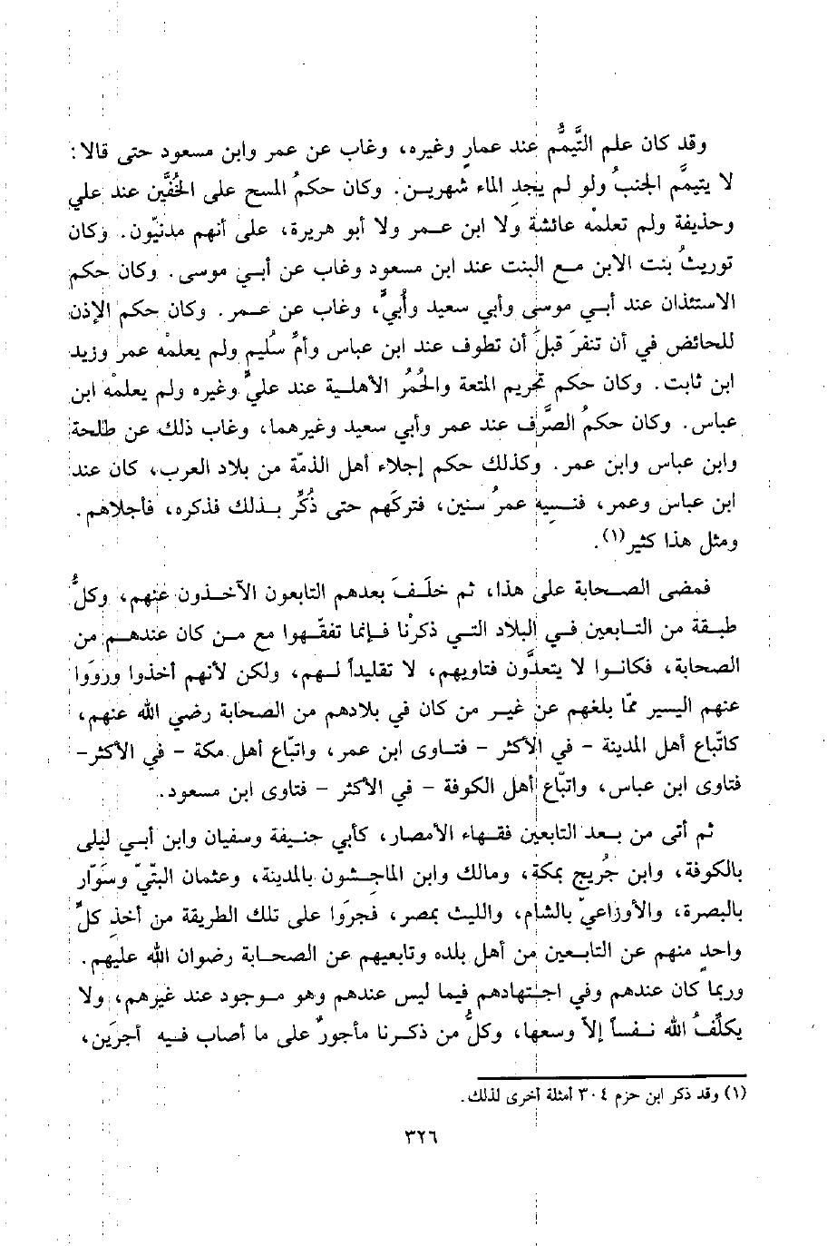 فَمضى الصَّحَابَة على هَذَا، ثمَّ خلف بعدهمْ التابعون الآخذون عَنْهُم، وكل طبقَة من التَّابِعين فِي الْبِلَاد الَّتِي ذكرنَا فَإِنَّمَا تفقهوا مَعَ من كَانَ عِنْدهم من الصَّحَابَة، فَكَانُوا لَا يتعدون فتاويهم، لَا تقليداً لَهُم، وَلَكِن لأَنهم أخذُوا وَرووا عَنْهُم الْيَسِير مِمَّا بَلغهُمْ عَن غير من كَانَ فِي بِلَادهمْ من الصَّحَابَة رَضِي الله عَنْهُم، كاتباع أهل الْمَدِينَة - فِي الْأَكْثَر - فَتَاوَى ابْن عمر، وَاتِّبَاع أهل مَكَّة - فِي الْأَكْثَر - فَتَاوَى ابْن عَبَّاس، وَاتِّبَاع أهل الْكُوفَة - فِي الْأَكْثَر - فَتَاوَى ابْن مَسْعُود.