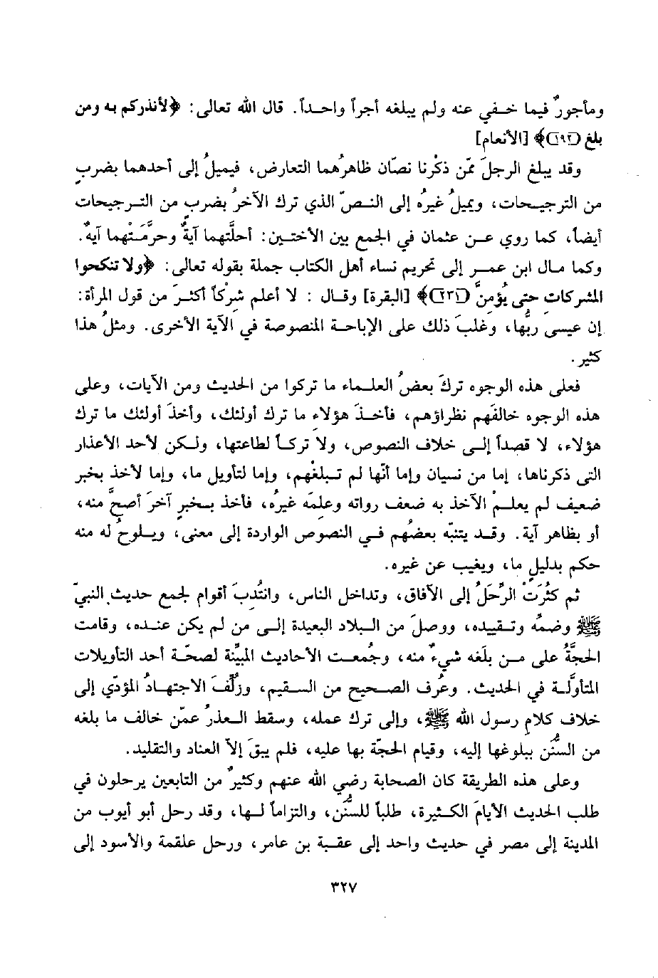 فعلى هَذِه الْوُجُوه ترك بعض الْعلمَاء مَا تركُوا من الحَدِيث وَمن الْآيَات، وعَلى هَذِه الْوُجُوه خالفهم نظراؤهم، فَأخذ هَؤُلَاءِ مَا ترك أُولَئِكَ. وَأخذ أُولَئِكَ مَا ترك هَؤُلَاءِ، لَا قصدا إِلَى خلاف النُّصُوص، وَلَا تركا لطاعتها، وَلَكِن لأحد الْأَعْذَار الَّتِي ذَكرنَاهَا، إِمَّا من نِسْيَان وَإِمَّا أَنَّهَا لم تبلغهم، وَإِمَّا لتأويل مَا، وَإِمَّا لأخذ بِخَبَر ضَعِيف لم يعلم الْآخِذ بِهِ ضعف رُوَاته وَعلمه غَيره، فَأخذ بِخَبَر آخر أصح مِنْهُ، أَو بِظَاهِر آيَة. وَقد يتَنَبَّه بَعضهم فِي النُّصُوص الْوَارِدَة إِلَى معنى، ويلوح لَهُ مِنْهُ حكم بدليلٍ مَا، ويغيب عَن غَيره.