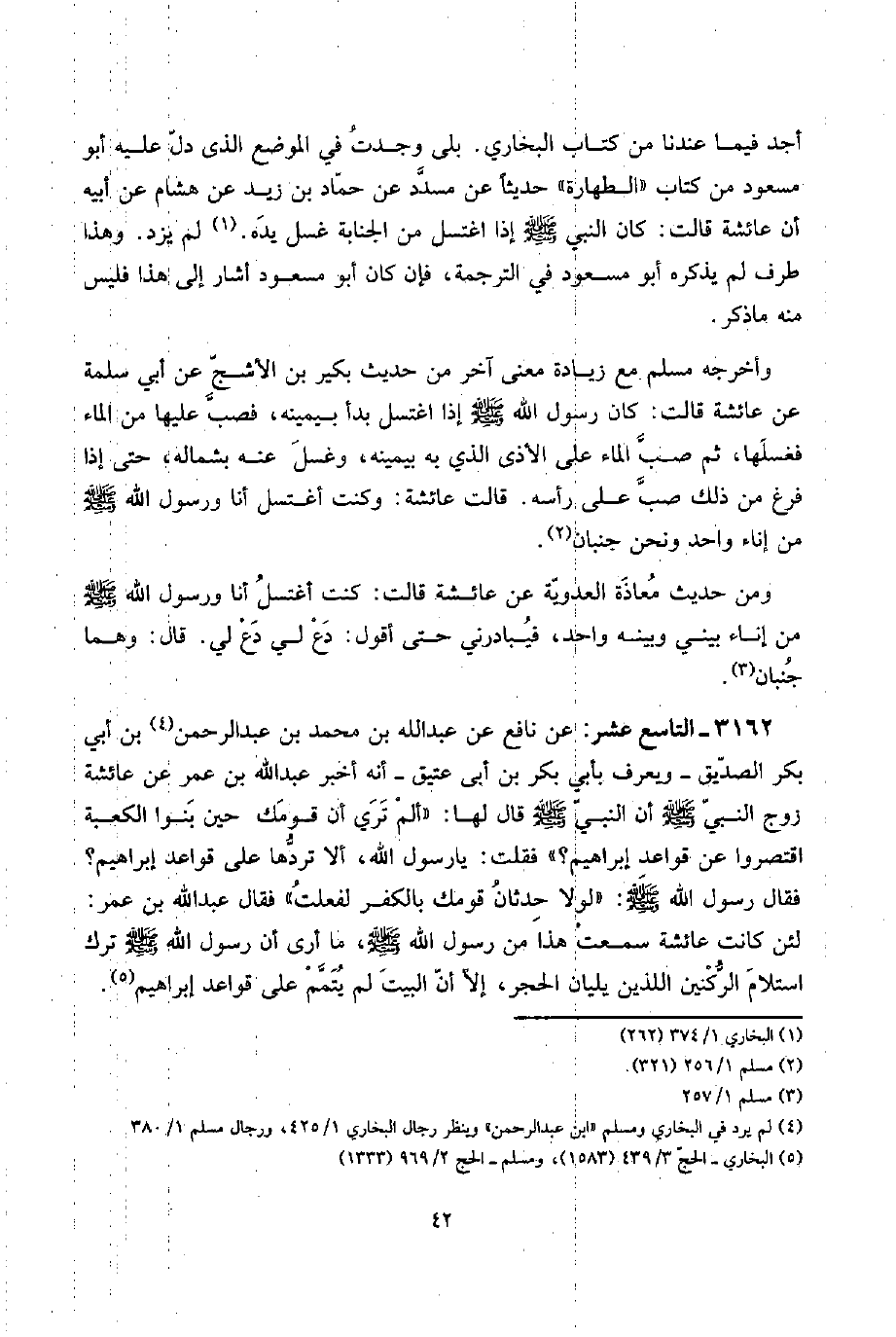 3162 - التَّاسِع عشر: عَن نَافِع عَن عبد الله بن مُحَمَّد بن عبد الرَّحْمَن بن أبي بكر الصّديق - وَيعرف بِأبي بكر بن أبي عَتيق - أَنه أخبر عبد الله بن عمر عَن عَائِشَة زوج النَّبِي صلى الله عَلَيْهِ وَسلم أَن النَّبِي صلى الله عَلَيْهِ وَسلم قَالَ لَهَا: " ألم تري أَن قَوْمك حِين بنوا الْكَعْبَة اقتصروا عَن قَوَاعِد إِبْرَاهِيم؟ " فَقلت: يَا رَسُول الله، أَلا تردها على قَوَاعِد إِبْرَاهِيم؟ فَقَالَ رَسُول الله صلى الله عَلَيْهِ وَسلم: " لَوْلَا حدثان قَوْمك بالْكفْر لفَعَلت " فَقَالَ عبد الله بن عمر: لَئِن كَانَت عَائِشَة سَمِعت هَذَا من رَسُول الله صلى الله عَلَيْهِ وَسلم، مَا أرى أَن رَسُول الله صلى الله عَلَيْهِ وَسلم ترك استلام الرُّكْنَيْنِ اللَّذين يليان الْحجر، إِلَّا أَن الْبَيْت لم يتمم على قَوَاعِد إِبْرَاهِيم.