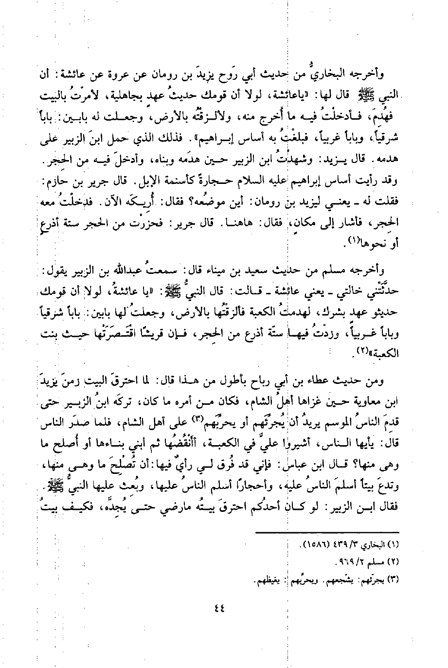 أَن النَّبِي صلى الله عَلَيْهِ وَسلم قَالَ لَهَا: " يَا عَائِشَة، لَوْلَا أَن قَوْمك حَدِيث عهدٍ بجاهلية، لأمرت بِالْبَيْتِ فهدم، فأدخلت فِيهِ مَا أخرج مِنْهُ، ولألزقته بِالْأَرْضِ، وَجعلت لَهُ بَابَيْنِ: بَابا شرقياً، وباباً غربياً، فبلغت بِهِ أساس إِبْرَاهِيم ". فَذَلِك الَّذِي حمل ابْن الزبير على هَدمه. قَالَ يزِيد: وَشهِدت ابْن الزبير حِين هَدمه وبناه، وَأدْخل فِيهِ من الْحجر.