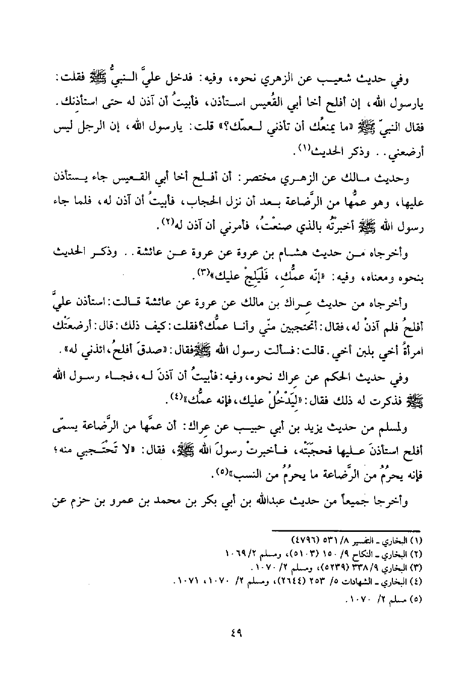 أَن أَفْلح أَخا أبي القعيس جَاءَ يسْتَأْذن عَلَيْهَا، وَهُوَ عَمها من الرضَاعَة بعد أَن نزل الْحجاب، فأبيت أَن آذن لَهُ، فَلَمَّا جَاءَ رَسُول الله صلى الله عَلَيْهِ وَسلم أخْبرته بِالَّذِي صنعت، فَأمرنِي أَن آذن لَهُ ".