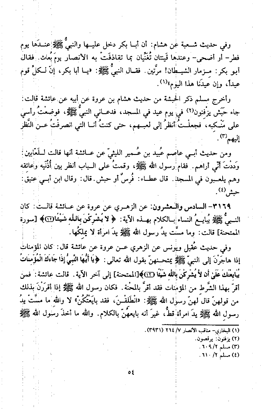 جَاءَ حبش يزفنون فِي يَوْم عيد فِي الْمَسْجِد، فدعاني النَّبِي صلى الله عَلَيْهِ وَسلم، فَوضعت رَأْسِي على مَنْكِبه، فَجعلت أنظر إِلَى لعبهم، حَتَّى كنت أَنا الَّتِي انصرفت عَن النّظر إِلَيْهِم.