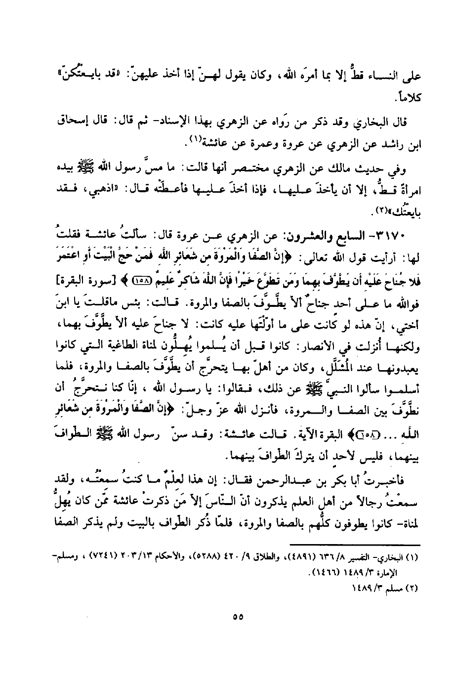 3170 - السَّابِع وَالْعشْرُونَ: عَن الزُّهْرِيّ عَن عُرْوَة قَالَ: سَأَلت عَائِشَة فَقلت لَهَا: أَرَأَيْت قَول الله تَعَالَى: {إِن الصَّفَا والمروة من شَعَائِر الله فَمن حج الْبَيْت أَو اعْتَمر فَلَا جنَاح عَلَيْهِ أَن يطوف بهما وَمن تطوع خيرا فَإِن الله شَاكر عليم} [سُورَة الْبَقَرَة] فوَاللَّه مَا على أحدٍ جناحٌ أَلا يطوف بالصفا والمروة. قَالَت: بئس مَا قلت يَا ابْن أُخْتِي، إِن هَذِه لَو كَانَت على مَا أولتها عَلَيْهِ كَانَت: لَا جنَاح عَلَيْهِ أَلا يطوف بهما، وَلكنهَا أنزلت فِي الْأَنْصَار: كَانُوا قبل أَن يسلمُوا يهلون لمناة الطاغية الَّتِي كَانُوا يعبدونها عِنْد المشلل، وَكَانَ من أهل بهما يتحرج أَن يطوف بالصفا والمروة، فَلَمَّا أَسْلمُوا سَأَلُوا النَّبِي صلى الله عَلَيْهِ وَسلم عَن ذَلِك، فَقَالُوا: يَا رَسُول الله، إِنَّا كُنَّا نتحرج أَن نطوف بَين الصَّفَا والمروة، فَأنْزل الله عز وَجل: {إِن الصَّفَا والمروة من شَعَائِر الله} الْبَقَرَة الْآيَة: قَالَت عَائِشَة: وَقد سنّ رَسُول الله صلى الله عَلَيْهِ وَسلم الطّواف بَينهمَا، فَلَيْسَ لأحدٍ أَن يتْرك الطّواف بَينهمَا.