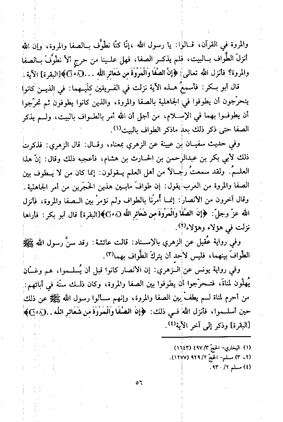 إِن الْأَنْصَار كَانُوا قبل أَن يسلمُوا، هم وغسان يهلون لمناة، فتحرجوا أَن يطوفوا بَين الصَّفَا والمروة، وَكَانَ ذَلِك سنة فِي آبَائِهِم: من أحرم لمناة لم يطف بَين الصَّفَا والمروة، وَإِنَّهُم سَأَلُوا رَسُول الله صلى الله عَلَيْهِ وَسلم عَن ذَلِك حِين أَسْلمُوا، فَأنْزل الله فِي ذَلِك: {إِن الصَّفَا والمروة من شَعَائِر الله} [الْبَقَرَة] وَذكر إِلَى آخر الْآيَة.