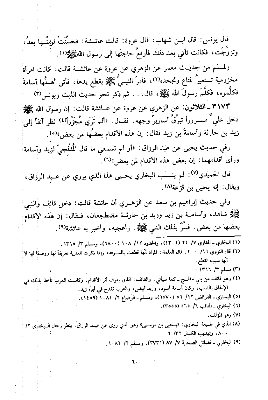 3173 - الثَّلَاثُونَ: عَن الزُّهْرِيّ عَن عُرْوَة عَن عَائِشَة قَالَت: إِن رَسُول الله صلى الله عَلَيْهِ وَسلم دخل عَليّ مَسْرُورا تبرق أسارير وَجهه. فَقَالَ: " ألم تري مجززاً نظر آنِفا إِلَى زيد بن حَارِثَة وَأُسَامَة بن زيد فَقَالَ: إِن هَذِه الْأَقْدَام بَعْضهَا من بعض ".