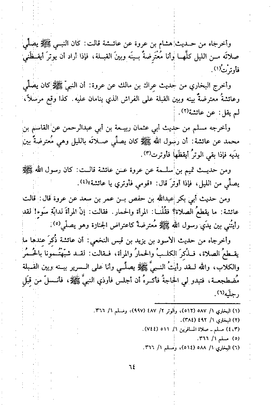 أَن عَائِشَة ذكر عِنْدهَا مَا يقطع الصَّلَاة، فَذكر الْكَلْب وَالْحمار وَالْمَرْأَة، فَقَالَت: لقد شبهتمونا بالحمر وَالْكلاب، وَالله لقد رَأَيْت النَّبِي صلى الله عَلَيْهِ وَسلم يُصَلِّي وَأَنا على السرير بَينه وَبَين الْقبْلَة مُضْطَجِعَة، فتبدو لي الْحَاجة فأكره أَن أَجْلِس فأوذي النَّبِي صلى الله عَلَيْهِ وَسلم، فأنسل من قبل رجلَيْهِ.