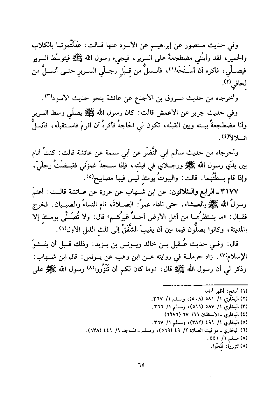 كَانَ رَسُول الله صلى الله عَلَيْهِ وَسلم يُصَلِّي وسط السرير وَأَنا مضطجعةٌ بَينه وَبَين الْقبْلَة، تكون لي الْحَاجة فأكره أَن أقوم فَاسْتَقْبلهُ، فأنسل انسلالاً.