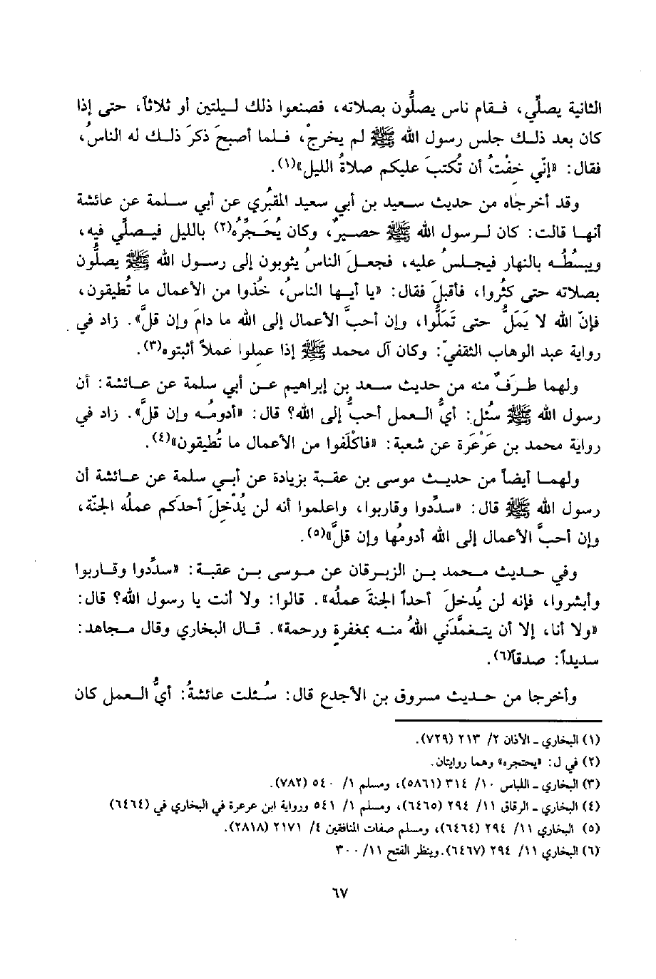 كَانَ لرَسُول الله صلى الله عَلَيْهِ وَسلم حصيرٌ، وَكَانَ يحجره بِاللَّيْلِ فَيصَلي فِيهِ، ويبسطه بِالنَّهَارِ فيجلس عَلَيْهِ، فَجعل النَّاس يثوبون إِلَى رَسُول الله صلى الله عَلَيْهِ وَسلم يصلونَ بِصَلَاتِهِ حَتَّى كَثُرُوا، فَأقبل فَقَالَ: " يَا أَيهَا النَّاس، خُذُوا من الْأَعْمَال مَا تطيقون، فَإِن الله لَا يمل حَتَّى تملوا، وَإِن أحب الْأَعْمَال إِلَى الله مَا دَامَ وَإِن قل ". زَاد فِي رِوَايَة عبد الْوَهَّاب الثَّقَفِيّ: وَكَانَ آل مُحَمَّد صلى الله عَلَيْهِ وَسلم إِذا عمِلُوا عملا أثبتوه.