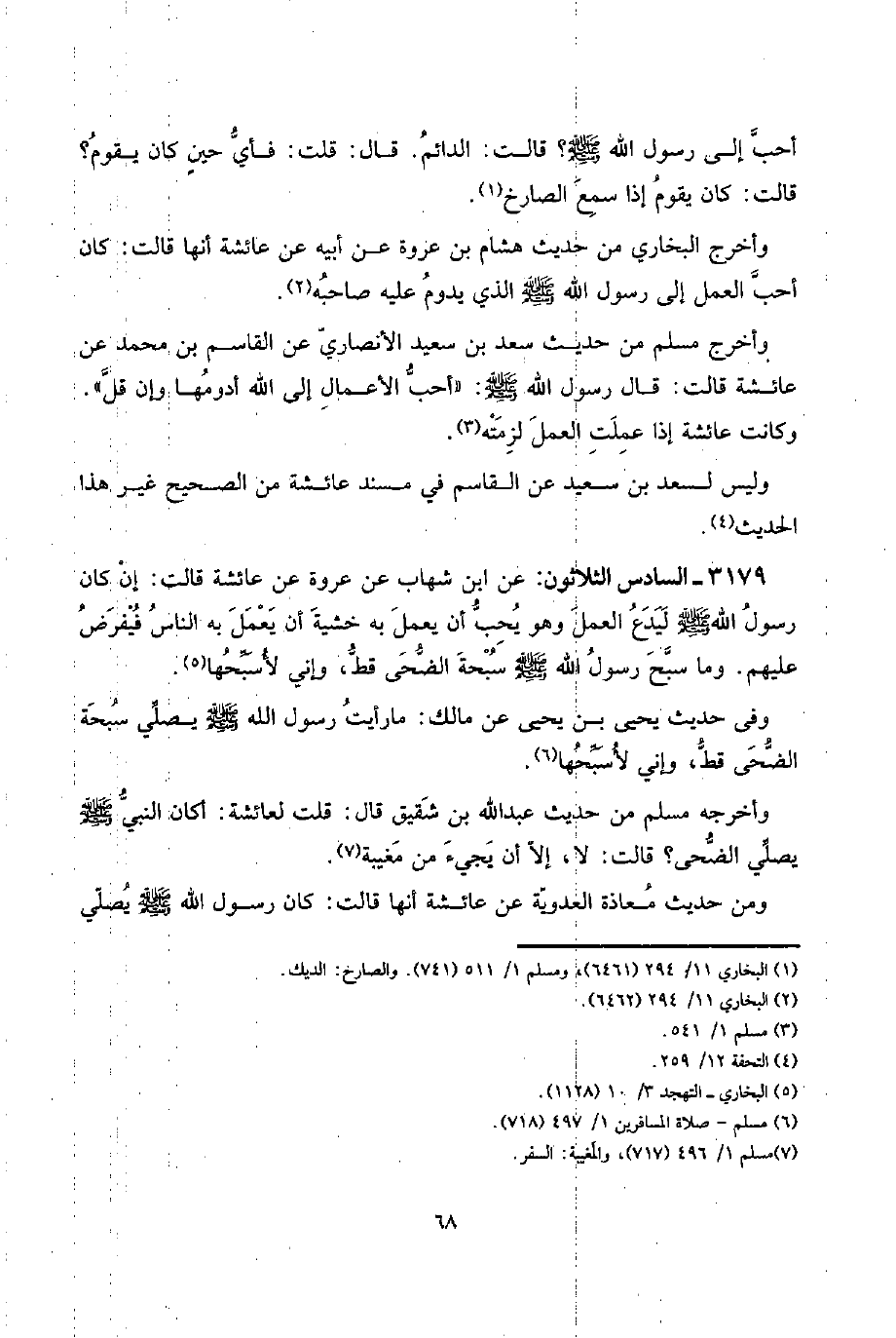 3179 - السَّادِس الثَّلَاثُونَ: عَن ابْن شهَاب عَن عُرْوَة عَن عَائِشَة قَالَت: إِن كَانَ رَسُول الله صلى الله عَلَيْهِ وَسلم ليَدع الْعَمَل وَهُوَ يحب أَن يعْمل بِهِ خشيَة أَن يعْمل بِهِ النَّاس فيفرض عَلَيْهِم. وَمَا سبح رَسُول الله صلى الله عَلَيْهِ وَسلم سبْحَة الضُّحَى قطّ، وَإِنِّي لأسبحها.