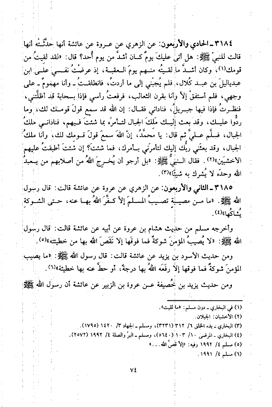 3184 - الْحَادِي وَالْأَرْبَعُونَ: عَن الزُّهْرِيّ عَن عُرْوَة عَن عَائِشَة أَنَّهَا حدثته أَنَّهَا قَالَت للنَّبِي صلى الله عَلَيْهِ وَسلم: هَل أَتَى عَلَيْك يومٌ كَانَ أَشد من يَوْم أحد؟ قَالَ: " لقد لقِيت من قَوْمك، وَكَانَ أَشد مَا لَقيته مِنْهُم يَوْم الْعقبَة، إِذْ عرضت نَفسِي على ابْن عبد يَا ليل بن عبد كلال، فَلم يجبني إِلَى مَا أردْت، فَانْطَلَقت - وَأَنا مهمومٌ - على وَجْهي، فَلم أستفق إِلَّا وَأَنا بقرن الثعالب، فَرفعت رَأْسِي فَإِذا بسحابة قد أظلتني، فَنَظَرت فَإِذا فِيهَا جِبْرِيل، فناداني فَقَالَ: إِن الله قد سمع قَول قَوْمك لَك، وَمَا ردوا عَلَيْك، وَقد بعث إِلَيْك ملك الْجبَال لتأمره بِمَا شِئْت فيهم، فناداني ملك الْجبَال، فَسلم عَليّ ثمَّ قَالَ: يَا مُحَمَّد، إِن الله سمع قَول قَوْمك لَك، وَأَنا ملك الْجبَال، وَقد بَعَثَنِي رَبك إِلَيْك لتأمرني بِأَمْرك، فَمَا شِئْت؟ إِن شِئْت أطبقت عَلَيْهِم الأخشبين ". فَقَالَ النَّبِي صلى الله عَلَيْهِ وَسلم: " بل أَرْجُو أَن يخرج الله من أصلابهم من يعبد الله وَحده لَا يُشْرك بِهِ شَيْئا ". 3185 - الثَّانِي وَالْأَرْبَعُونَ: عَن الزُّهْرِيّ عَن عُرْوَة عَن عَائِشَة قَالَت: قَالَ رَسُول الله صلى الله عَلَيْهِ وَسلم. " مَا من مصيبةٍ تصيب الْمُسلم إِلَّا كفر الله بهَا عَنهُ، حَتَّى الشَّوْكَة يشاكها ".