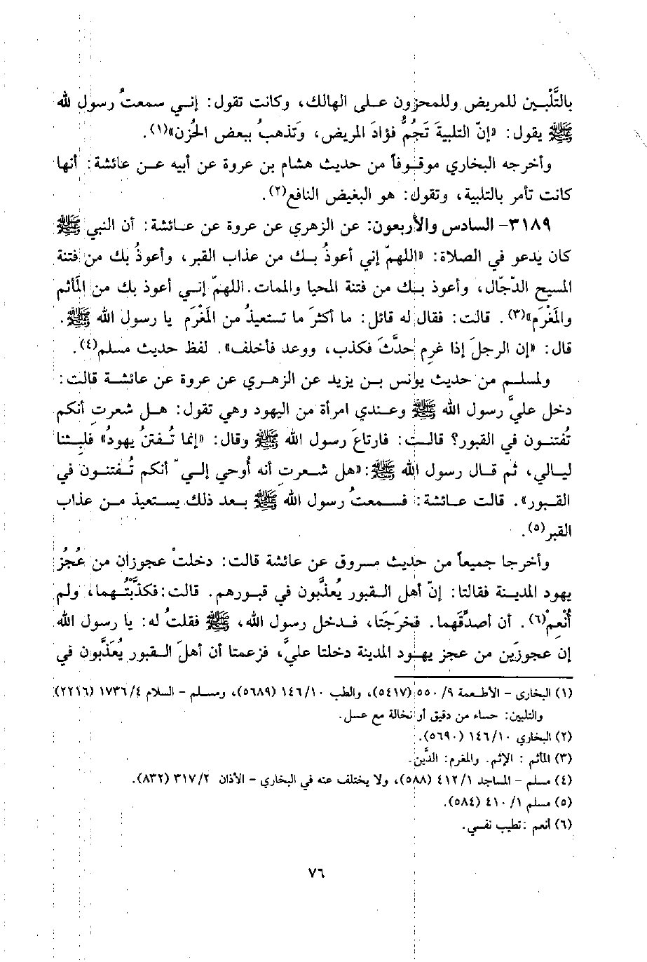 3189 - السَّادِس وَالْأَرْبَعُونَ: عَن الزُّهْرِيّ عَن عُرْوَة عَن عَائِشَة: أَن النَّبِي صلى الله عَلَيْهِ وَسلم كَانَ يَدْعُو فِي الصَّلَاة: " اللَّهُمَّ إِنِّي أعوذ بك من عَذَاب الْقَبْر، وَأَعُوذ بك من فتْنَة الْمَسِيح الدَّجَّال، وَأَعُوذ بك من فتْنَة الْمحيا وَالْمَمَات. اللَّهُمَّ إِنِّي أعوذ بك من المآثم والمغرم ". قَالَت: فَقَالَ لَهُ قَائِل: مَا أَكثر مَا تستعيذ من المغرم يَا رَسُول الله صلى الله عَلَيْهِ وَسلم.