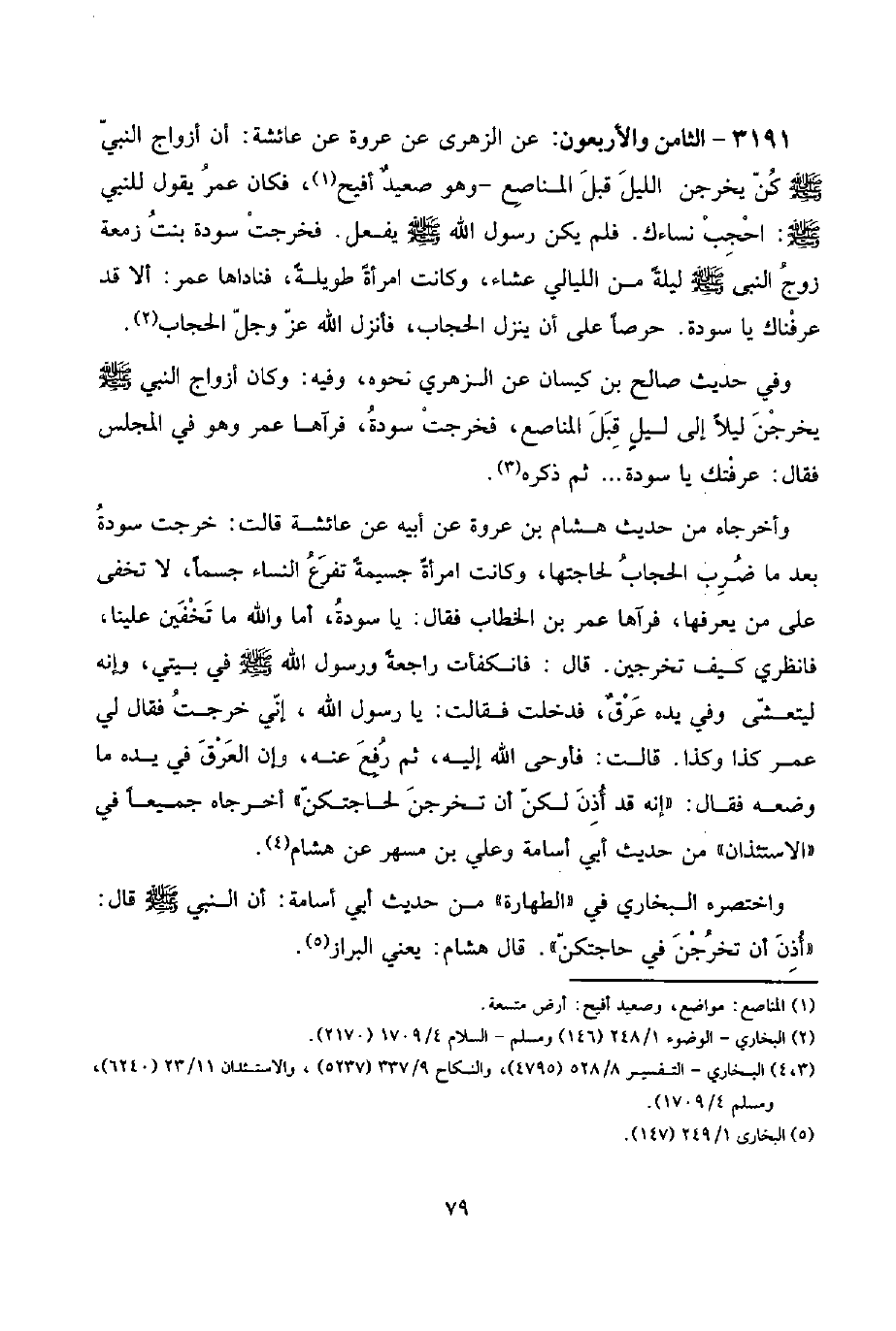3191 - الثَّامِن وَالْأَرْبَعُونَ: عَن الزُّهْرِيّ عَن عُرْوَة عَن عَائِشَة: أَن أَزوَاج النَّبِي صلى الله عَلَيْهِ وَسلم كن يخْرجن اللَّيْل قبل المناصع - وَهُوَ صعيدٌ أفيح، فَكَانَ عمر يَقُول للنَّبِي صلى الله عَلَيْهِ وَسلم: احجب نِسَاءَك. فَلم يكن رَسُول الله صلى الله عَلَيْهِ وَسلم يفعل. فَخرجت سَوْدَة بنت زَمعَة زوج النَّبِي صلى الله عَلَيْهِ وَسلم لَيْلَة من اللَّيَالِي عشَاء، وَكَانَت امْرَأَة طَوِيلَة، فناداها عمر: أَلا قد عرفناك يَا سَوْدَة. حرصاً على أَن ينزل الْحجاب، فَأنْزل الله عز وَجل الْحجاب.