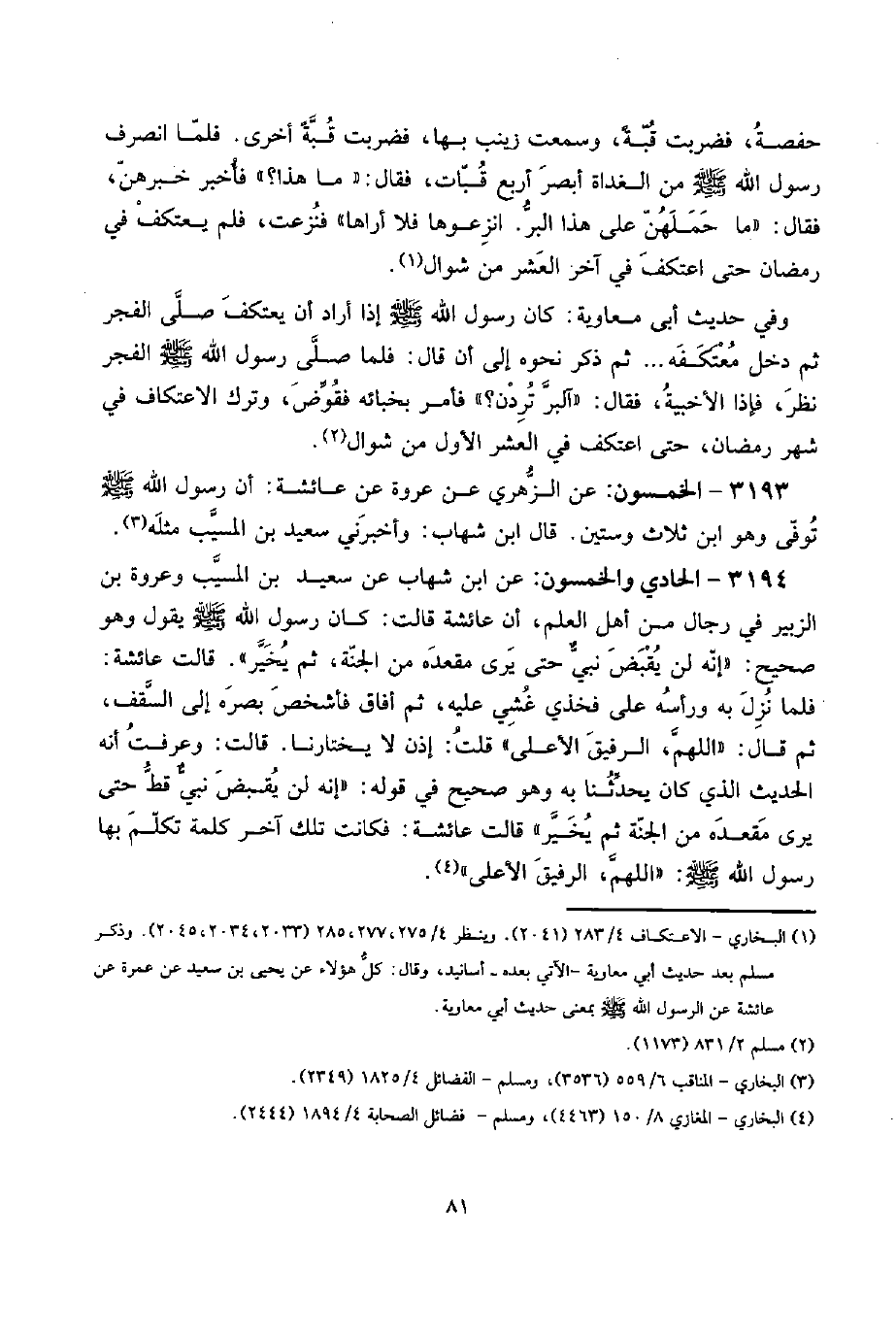 3194 - الْحَادِي وَالْخَمْسُونَ: عَن ابْن شهَاب عَن سعيد بن الْمسيب وَعُرْوَة بن الزبير فِي رجال من أهل الْعلم، أَن عَائِشَة قَالَت: كَانَ رَسُول الله صلى الله عَلَيْهِ وَسلم يَقُول وَهُوَ صَحِيح: " إِنَّه لن يقبض نبيٌّ حَتَّى يرى مَقْعَده من الْجنَّة، ثمَّ يُخَيّر ". قَالَت عَائِشَة: فَلَمَّا نزل بِهِ وَرَأسه على فَخذي غشي عَلَيْهِ، ثمَّ أَفَاق فأشخص بَصَره إِلَى السّقف، ثمَّ قَالَ: " اللَّهُمَّ، الرفيق الْأَعْلَى " قلت: إِذن لَا يختارنا. قَالَت: وَعرفت أَنه الحَدِيث الَّذِي كَانَ يحدثنا بِهِ وَهُوَ صَحِيح فِي قَوْله: " إِنَّه لن يقبض نبيٌّ قطّ حَتَّى يرى مَقْعَده من الْجنَّة ثمَّ يُخَيّر " قَالَت عَائِشَة: فَكَانَت تِلْكَ آخر كلمة تكلم بهَا رَسُول الله صلى الله عَلَيْهِ وَسلم: " اللَّهُمَّ، الرفيق الْأَعْلَى ".