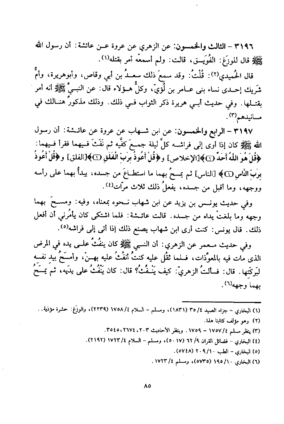 3197 - الرَّابِع وَالْخَمْسُونَ: عَن ابْن شهَاب عَن عُرْوَة عَن عَائِشَة: أَن رَسُول الله صلى الله عَلَيْهِ وَسلم كَانَ إِذا أَوَى إِلَى فرَاشه كل لَيْلَة جمع كفيه ثمَّ نفث فيهمَا فَقَرَأَ فيهمَا: {قل هُوَ الله أحد} [الْإِخْلَاص] و {قل أعوذ بِرَبّ الفلق} [الفلق] و {قل أعوذ بِرَبّ النَّاس} [النَّاس] ثمَّ يمسح بهما مَا اسْتَطَاعَ من جسده، يبْدَأ بهما على رَأسه وَوَجهه، وَمَا أقبل من جسده، يفعل ذَلِك ثَلَاث مَرَّات.