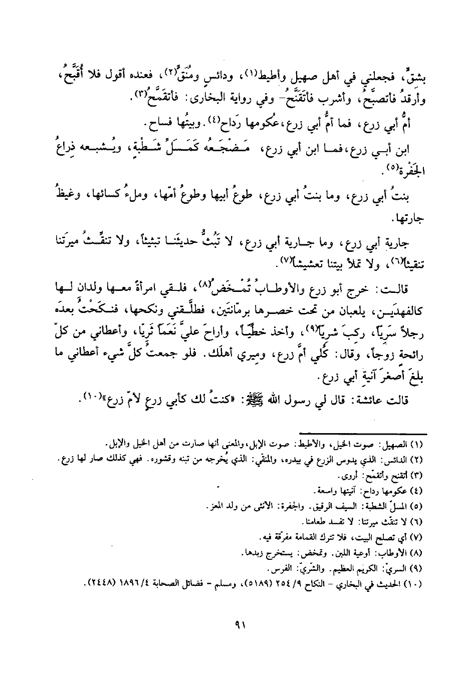خرج أَبُو زرع والأوطاب تمخض، فلقي امْرَأَة مَعهَا ولدان لَهَا كالفهدين، يلعبان من تَحت خصرها برمانتين، فطلقني ونكحها، وفنكحت بعده رجلا سرياً، ركب شرياً، وَأخذ خطياً، وأراح عَليّ نعما ثريا، وَأَعْطَانِي من كل رائحةٍ زوجا، وَقَالَ: كلي أم زرع، وميري أهلك. فَلَو جمعت كل شَيْء أَعْطَانِي مَا بلغ أَصْغَر آنِية أبي زرع.