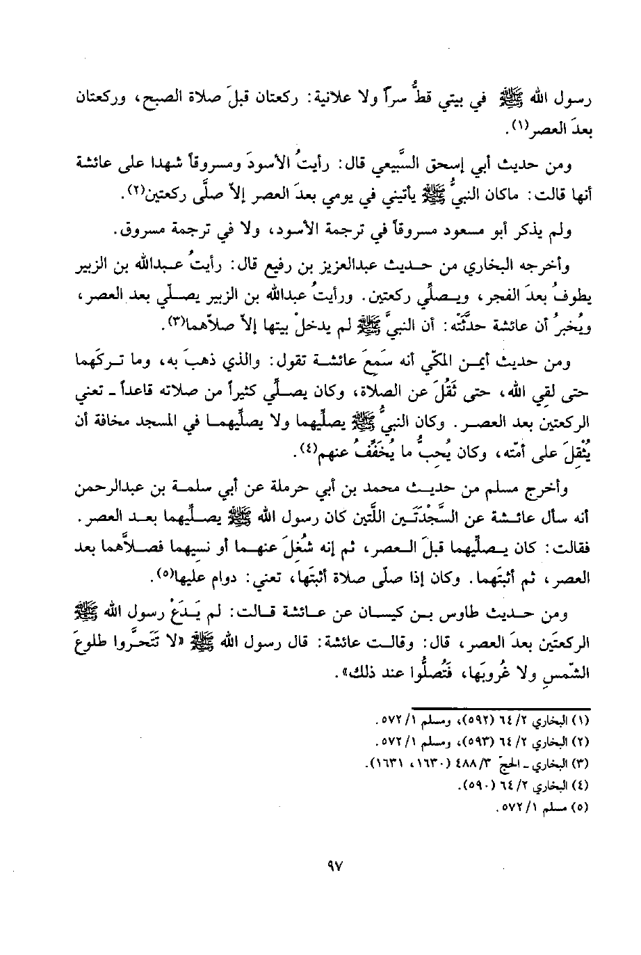 رَسُول الله صلى الله عَلَيْهِ وَسلم فِي بَيْتِي قطّ سرا وَلَا عَلَانيَة: رَكْعَتَانِ قبل صَلَاة الصُّبْح، وركعتان بعد الْعَصْر.