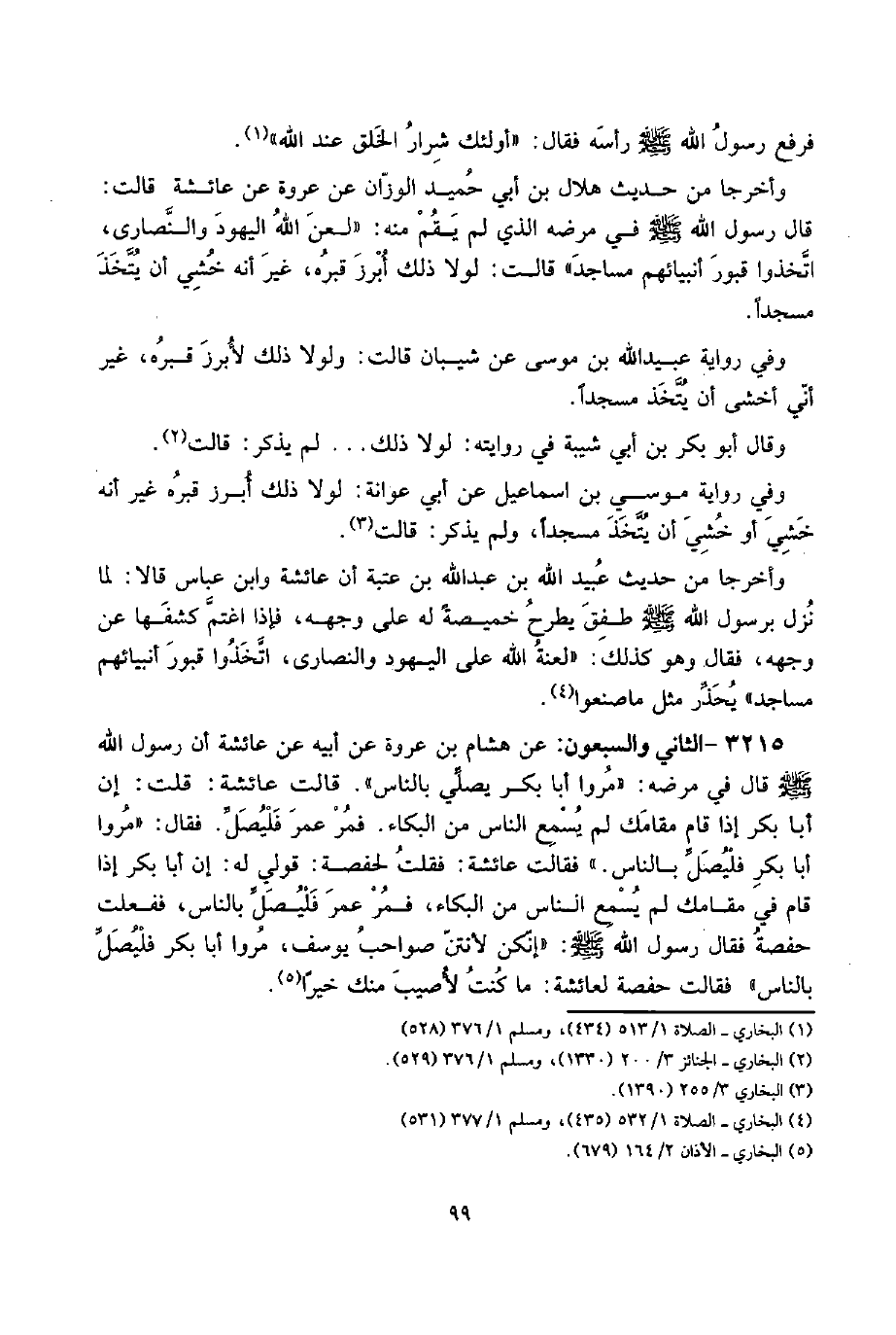 3215 - الثَّانِي وَالسَّبْعُونَ: عَن هِشَام بن عُرْوَة عَن أَبِيه عَن عَائِشَة أَن رَسُول الله صلى الله عَلَيْهِ وَسلم قَالَ فِي مَرضه: " مروا أَبَا بكر يُصَلِّي بِالنَّاسِ ". قَالَت عَائِشَة: قلت: إِن أَبَا بكر إِذا قَامَ مقامك لم يسمع النَّاس من الْبكاء. فَمر عمر فَليصل. فَقَالَ: " مروا أَبَا بكر فَليصل بِالنَّاسِ. " فَقَالَت عَائِشَة: فَقلت لحفصة: قولي لَهُ: إِن أَبَا بكر إِذا قَامَ فِي مقامك لم يسمع النَّاس من الْبكاء، فَمر عمر فَليصل بِالنَّاسِ، فَفعلت حَفْصَة فَقَالَ رَسُول الله صلى الله عَلَيْهِ وَسلم: " إنكن لأنتن صَوَاحِب يُوسُف، مروا أَبَا بكر فَليصل بِالنَّاسِ " فَقَالَت حَفْصَة لعَائِشَة: مَا كنت لأصيب مِنْك خيرا ".