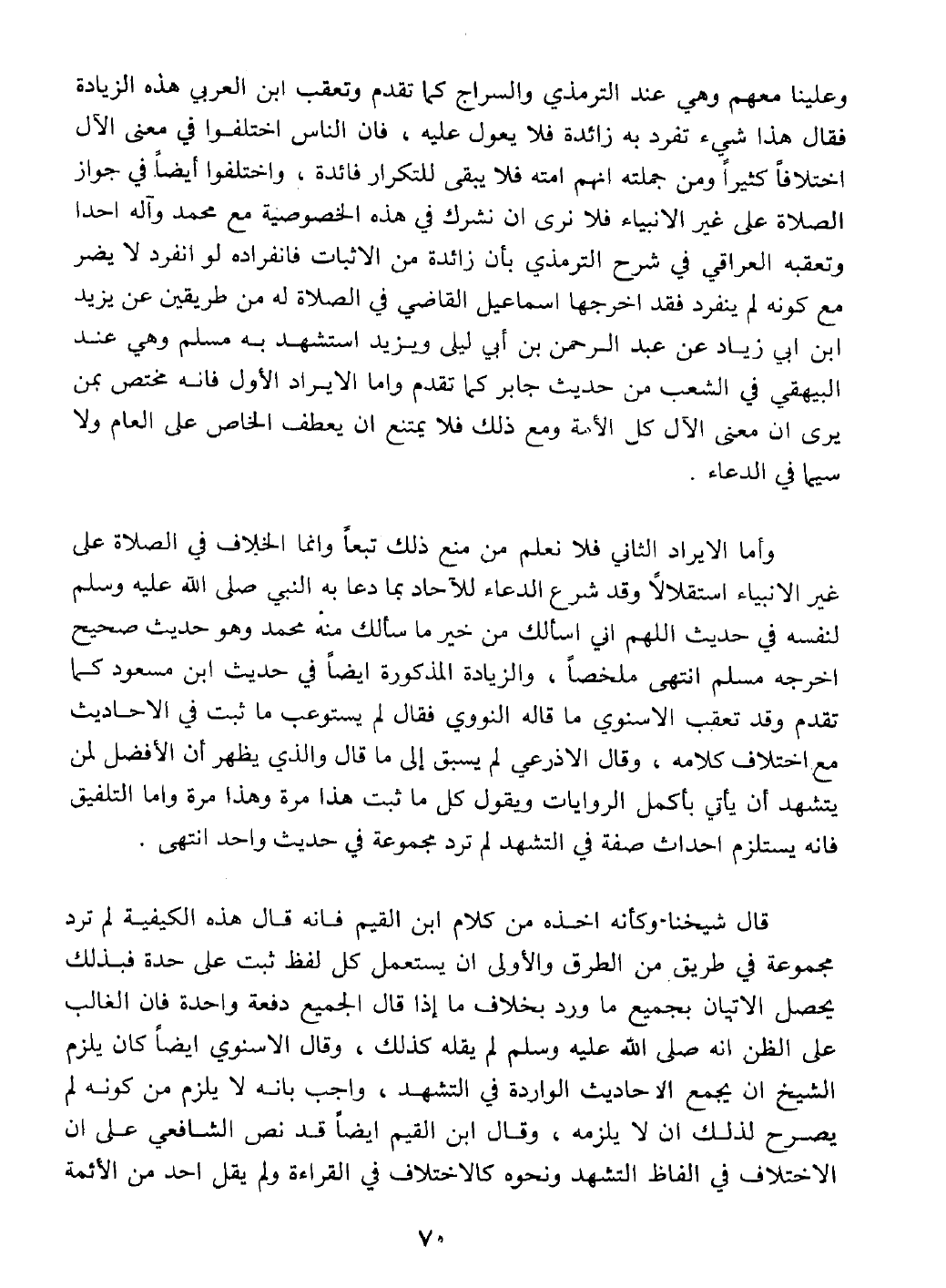 وأما الإيراد الثاني فلا نعلم من منع ذلك تبعاً وإنما الخلاف في الصلاة على غير الأنبياء استقلالاً وقد شرع الجعاء للآحاد بما دعا به النبي - صلى الله عليه وسلم - لنفيه في حديث اللهم أني اسألك منه محمد وهو حديث صحيح أخرجه مسلم انتهى ملخصاً، والزيادة المذكورة أيضاً في حديث ابن مسعود كما تقدم وقد تعقب الأسنوي ما قاله النووي فقال لم يستوعب ما ثبت في الأحاديث مع اختلاف كلامه، وقال الأذرعي لم يسبق إلى ما قاله والذي يظهر أن الأفضل لمن يتشهد أن يأتي بأكمل الروايات ويقول كل ما ثبت هذه مرة وهذه مرة وإما التلفيق فإنه يستلزم أحداث صفة في التشهد لم ترد مجموعة في حديث واحد انتهى.