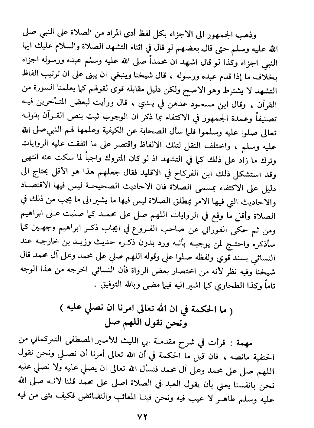 مهمة: قرأت في شرح مقدمة أبي الليث للأمير المصطفى التركماني من الحنفية مانصة، فإن قيل: ما الحكمة في أن الله تعالى أمرنا أن نصلي ونحن نقول اللهم صل على محمد وعلى آل محمد فنسأل الله تعالى أن يصلص عليه ولا نصلي عليه نحن بأنفينا يعني بأن يقول العبد في الصلاة أصلى على محمد قلنا لأنه - صلى الله عليه وسلم - طاهر لا عيب فيه ونحن فينا المعائب والنقائص فكيف يثنى من فيه