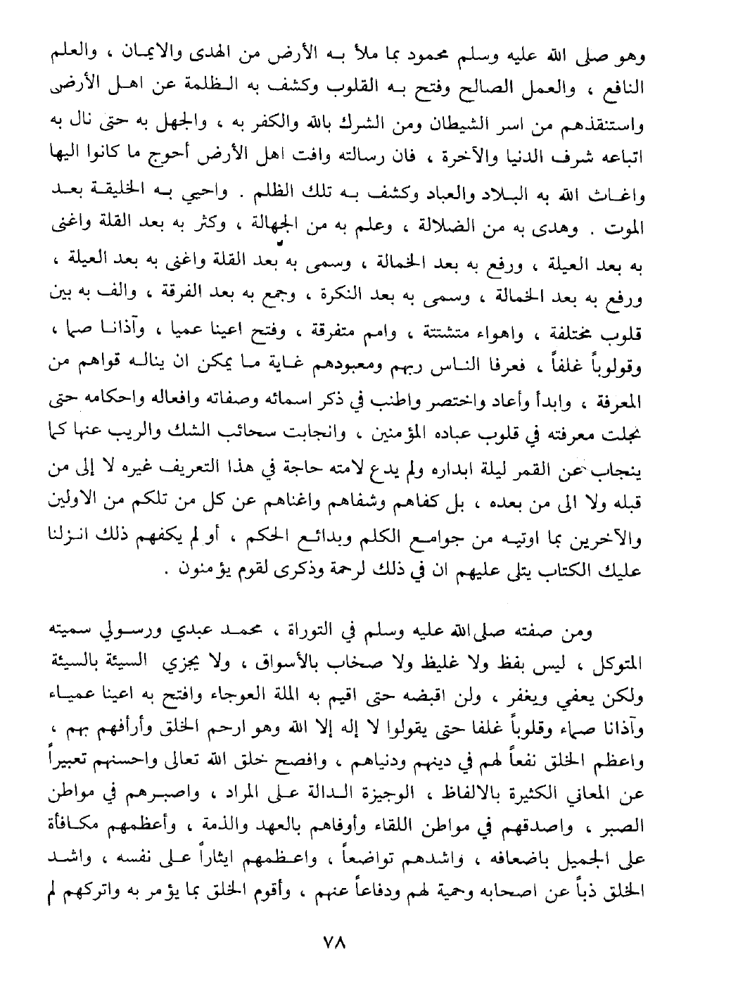 ومن صفته - صلى الله عليه وسلم - في التوارة، محمد عبدي ورسولي سميته المتوكل، ليس بلفظ ولا غليظ ولا صخاب بالأسواق، ولا يجزي السيئة بالسيئة ولكن يعفي ويغفر، ولن أقبضه حتى أقيم به الملة العوجاء وأفتح به أعينا عمياء وآذاناً صماء وقلوباً غلفا حتى يقولوا لا إله إلا الله وهو أرحم الخلق وأرأفهم بهم، وأعظم الخلق نفعاً لهم في دينهم ودنياهم، وأفصح خلق الله تعالى وأحسنهم تعبيراً عن المعاني الكثيرة بالألفاظ، الوجيزة الدالة على المراد، وأصبرهم في مواطن الصبر، وأصدقهم في مواطن اللقاء وأوفاهم بالعهد والذمة، وأعظمهم مكافأة على الجميل باصعافه، وأشدهم تواضعاً، وأعظمهم إيثاراً على نفيه، وأشد الخلق ذباً عن اصحابه وحمية لهم ودفاعاً عنهم، وأقوم الخلق بما يؤملا به وأتركهم لم