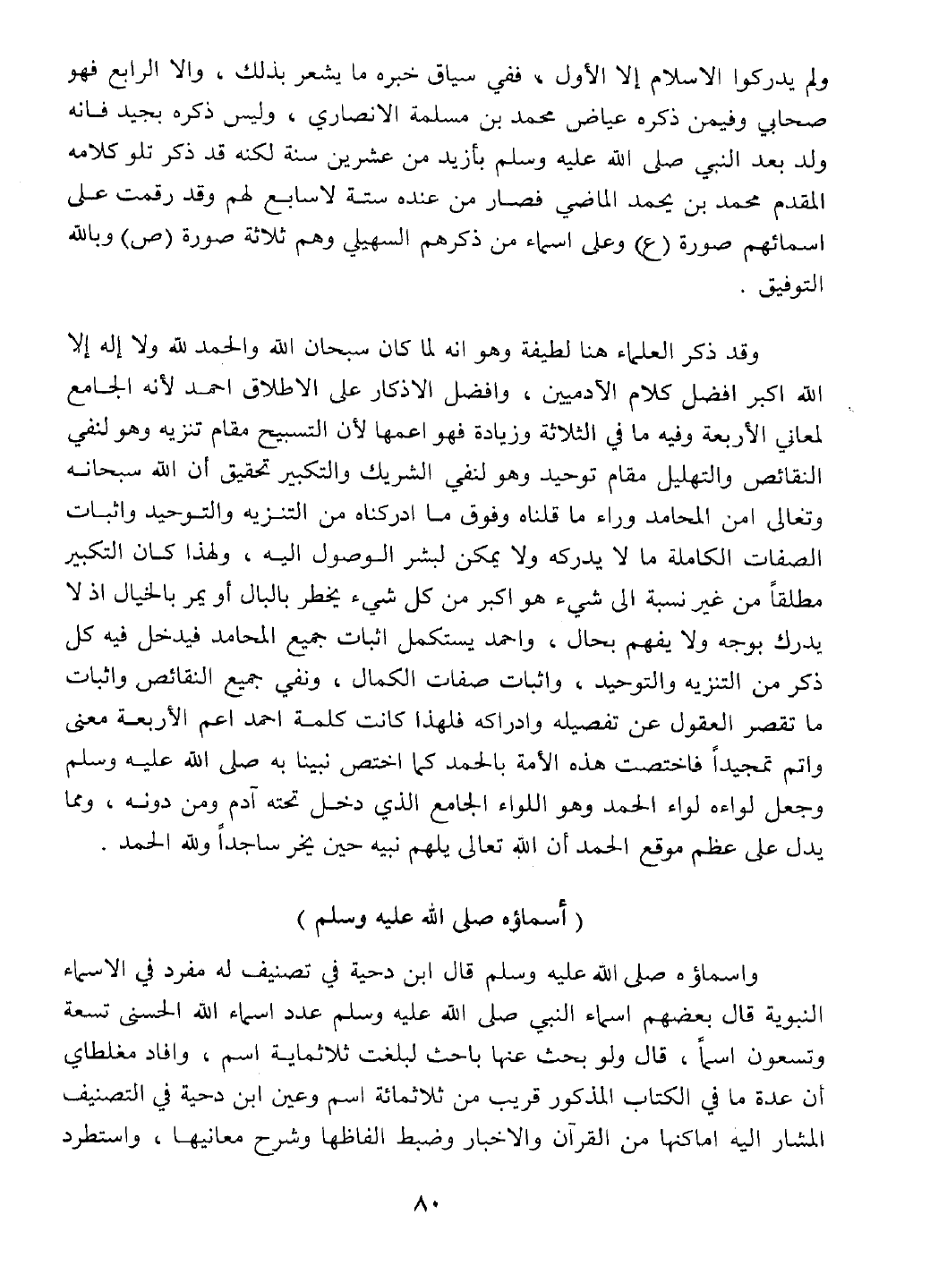 واسماؤه - صلى الله عليه وسلم - قال ابن دحية في تصنيف له مفرد في الاسماء النبوية قال بعضهم اسماء النبي - صلى الله عليه وسلم - عدد اسماء الله الحسنى تسعة وتسعون اسماً، قال ولو بحث عنها باحث لبلغت ثلاثمائة اسم، وأفاد مغلطاي أن عدة ما في الكتاب المذكور قريب من ثلاثمائة اسم وعين ابن دحية في التصنيف المشار إليه أماكنها من القرآن والأخبار وضبط الفاظها وشرح معانيها، واستطرد