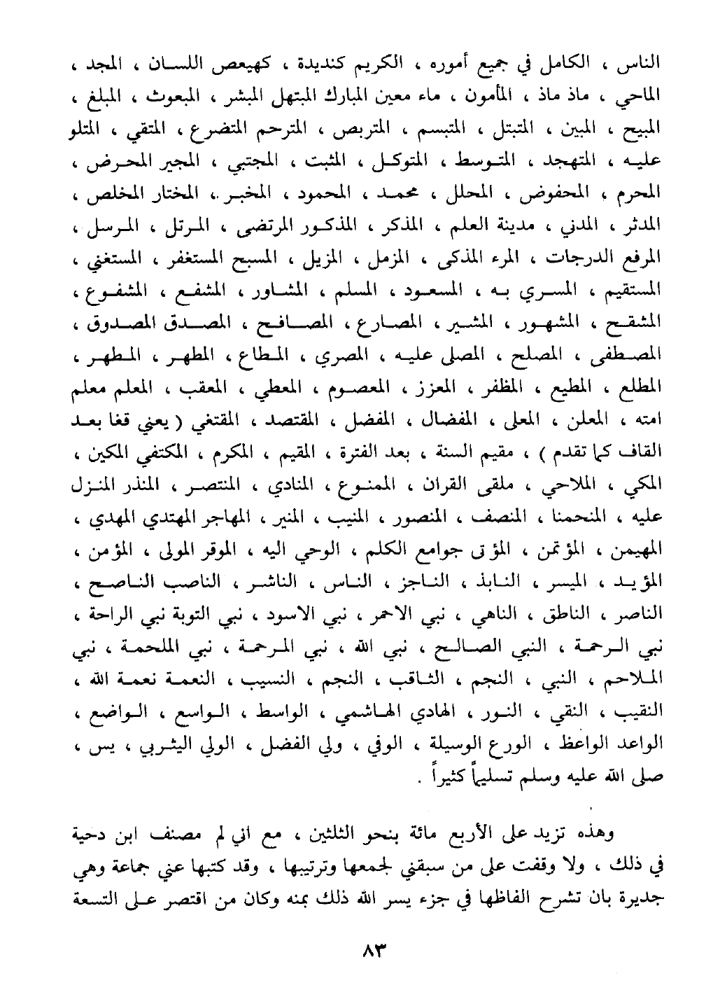 الناس، الكامل في جميع أموره، الكريم كنديدة، كهيعص اللسان، المجد، الماحي، ماذ ماذ، المأمون، ماء معين المبارك المبتهل المبشر، المبعوث، المبلغ، المبيح، المبين، المتبتل، المتبسم، المتربص، المترحم المتضرع، المتقي، المتلو عليه، المتهجد، المتوسط، المتوكل، المثبت، المجتبي، المجير المحرض، المحر، المحفوض، المحلل، محمد، المحمود، المخبر، المختار المخلص، المدثر، المدني، مدينة العلم، المذكر، المذكور المرتضى، المرتل، المرتل، المرسل، المرفع الدرجات، المرء المذكى، المزمل، المزيل، المسبح المستغفر، المستغني، المستقيم، المسري به، المسعود، المسلم، المشاور، المشفع، المشفوع، المشقح، المشهور، المشير، المصارع، المصافح، المصدق المصدوق، المصطفى، المصلح، المصلي عليه، المصري، المطاع، المطهر، المطهر، المطلع، المطيع، المظفر، المعزز، المعصوم، المعطي، المعقب، المعلم معلم امته، المعلن، المعلى، المفضال، المفضل، المقتصد، المقتغي (يعني قغا بعد القاف كما تقدم) ، مقيم السنة، بعد الفترة، المقيم، المكرم، المكتفي المكين، المكي، الملاحي، ملقى القرآن، الممنوع، المنادي، المنتصر، المنذر المنزل عليه، المنحمنا، المنصف، المنصور، المنين، المنير، المهاجر المهتدي المهدي، المهيمن، المؤتمن، المؤتي جوامع الكلم، الوحي إليه، الموقر المولى، المؤمن، المؤيد، اليسر، النابذ، الناجز، الناس، الناشر، الناصب، الناصب الناصح، الناصر، الناطق، الناهي، نبي الأحمر، نبي الأسود، نبي التوبة نبي الراحة، نبي الرحمة، النبي الصالح، نبي الله، نبي الرمرحمة، نبي الملحمة، نبي الملاحم، النبي، لبنجم، الثاقب، النجم، النسيب، النعمة نعمة الله، النقيب، النقي، النور، الهادي الهاشمي، الواسط، الواسع، الزاضع، الواعد الواعظ، الورع الوسيلة، الوفي، ولي الفضل، الولي اليثربي، يس، - صلى الله عليه وسلم - تسليماً كثيراً.