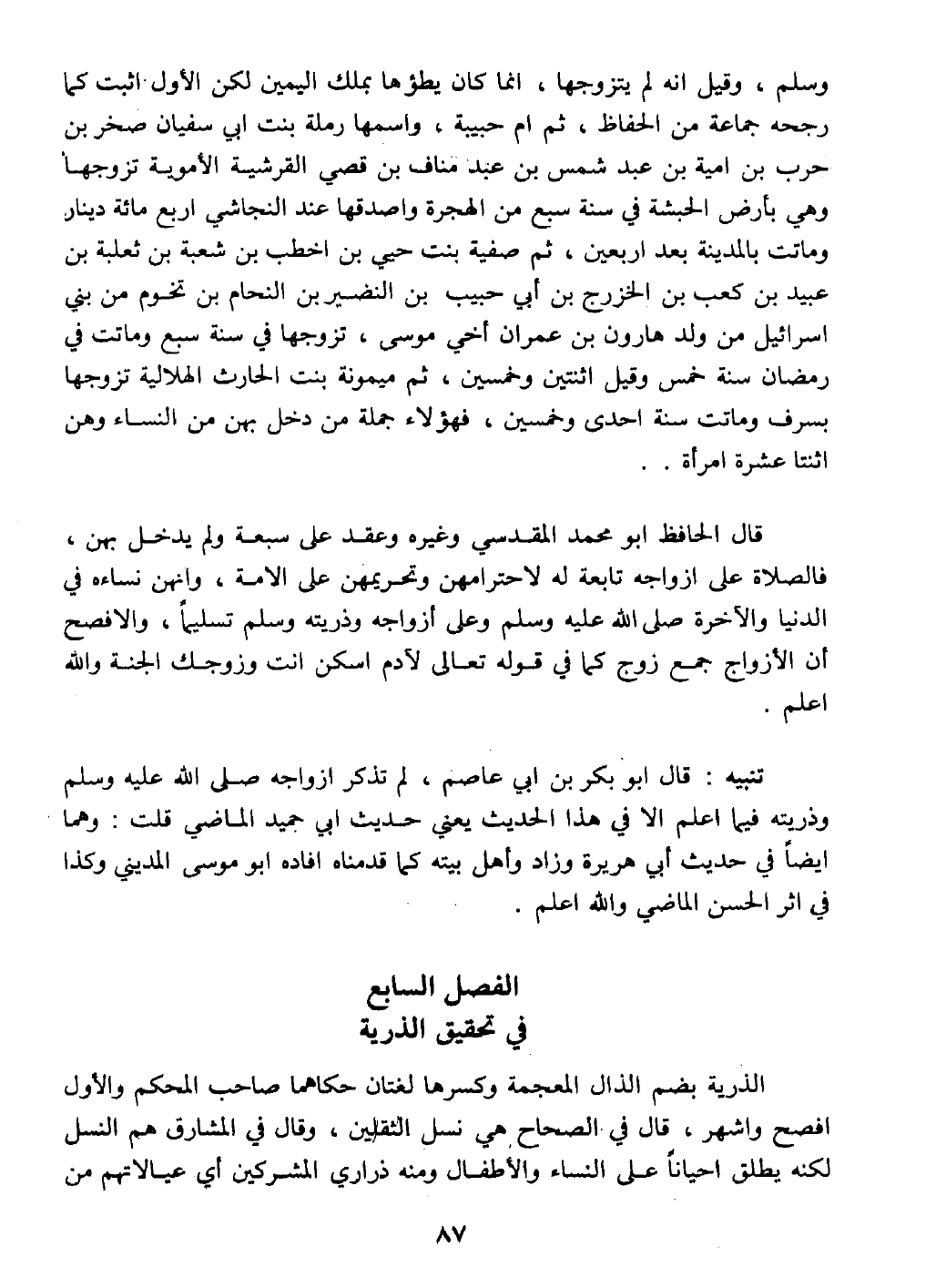 وسلم -، وقيل أنه لم يتزوجها، إنما كان يطؤها بملك اليمين لكن الأول أثبت كما رجحه جماعة من الحفاظ، ثم أم حبيبة، واسمها رملة بنت أبي سفيان صخر بن حرب بن أمية بن عبد شمس بن عبد مناف بن قصي القرشية الأموية تزوجها وهي بأرض الحبشة في سنة سبع من الهجرة وأصدقها عند النجاشي أربع دينار وماتت بالمدينة بعد أربعين، ثم صفية بنت حيي بن اخطب بن شعبة بن ثعلبة بن عبيد بن كعب بن الخزرج بن أبي حبيب بن النضير بن النحام بن تخوم من بني إسرائيل من ولد هارون بن عمران أخي موسى، تزوجها في سنة سبع وماتت في رمضان خمس وقيل اثنتين وخمسين، ثم ميمونة بنت الحارث الهلالية تزوجها بسرف وماتت سنة احدى وخمسين، فهؤلاء جملة من دخل بهن من النساء وهن اثنتا عشرة امرأة....
