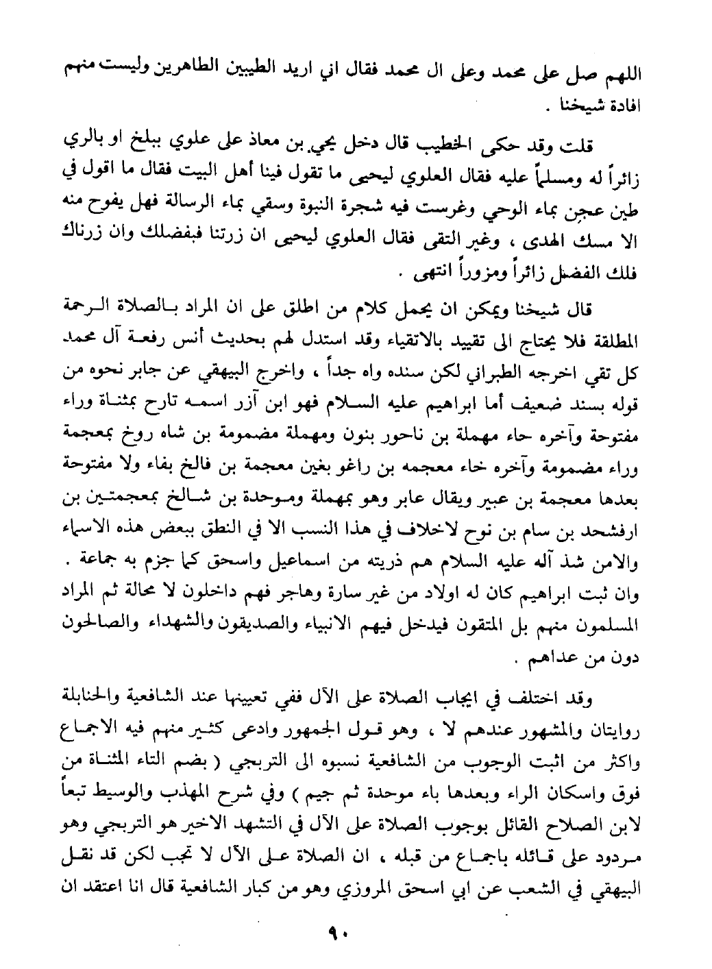 قال شيخنا ويمكن أن يحمل كلام من أطلق على أن المراد بالصلاة الرحمة المطلقة فلا يحتاج إلى تقييد بالإتقياء وقد أستدل لهم بحديث أنس رفعة آل محمد كل تقي أخرجه الطبراني لكن سنده واه جداً، وأخرج البيهقي عن جابر نحوه من قوله بسند ضعيف أما إبراهيم عليه السلام فهو ابن آزر اسمه تارح بمثناه وراء مفتوحة وآخره حاء مهملة بن ناحور بنون ومهملة مضمومة بن شاه روخ بمعجمة وراء مضمومة وآخره خاء معجمه بن راغو بغين معجمه بن فالح بفاء ولا مفتوحة بعدها معجمه بن عبير ويقال عابر وهو بمهملة وموحدة بن شالخ بمعجمتين بن ارفحشد بن سام بن نوح لاخلاف في هذا النسب إلا في النطق ببعض هذه الاسماء والامن شذ آله عليه السلام هم ذريته من إسماعيل وإسحق كما جزم به جماعة. وإن ثبت إبراهيم كان له أولاد من غير سارة وهاجر فهم داخلون لا محالة ثم المراد المسلمون منهم بل المتقون فيدخل فيهم الأنبياء والصديقون والشهداء والصالحون دون من عداهم.