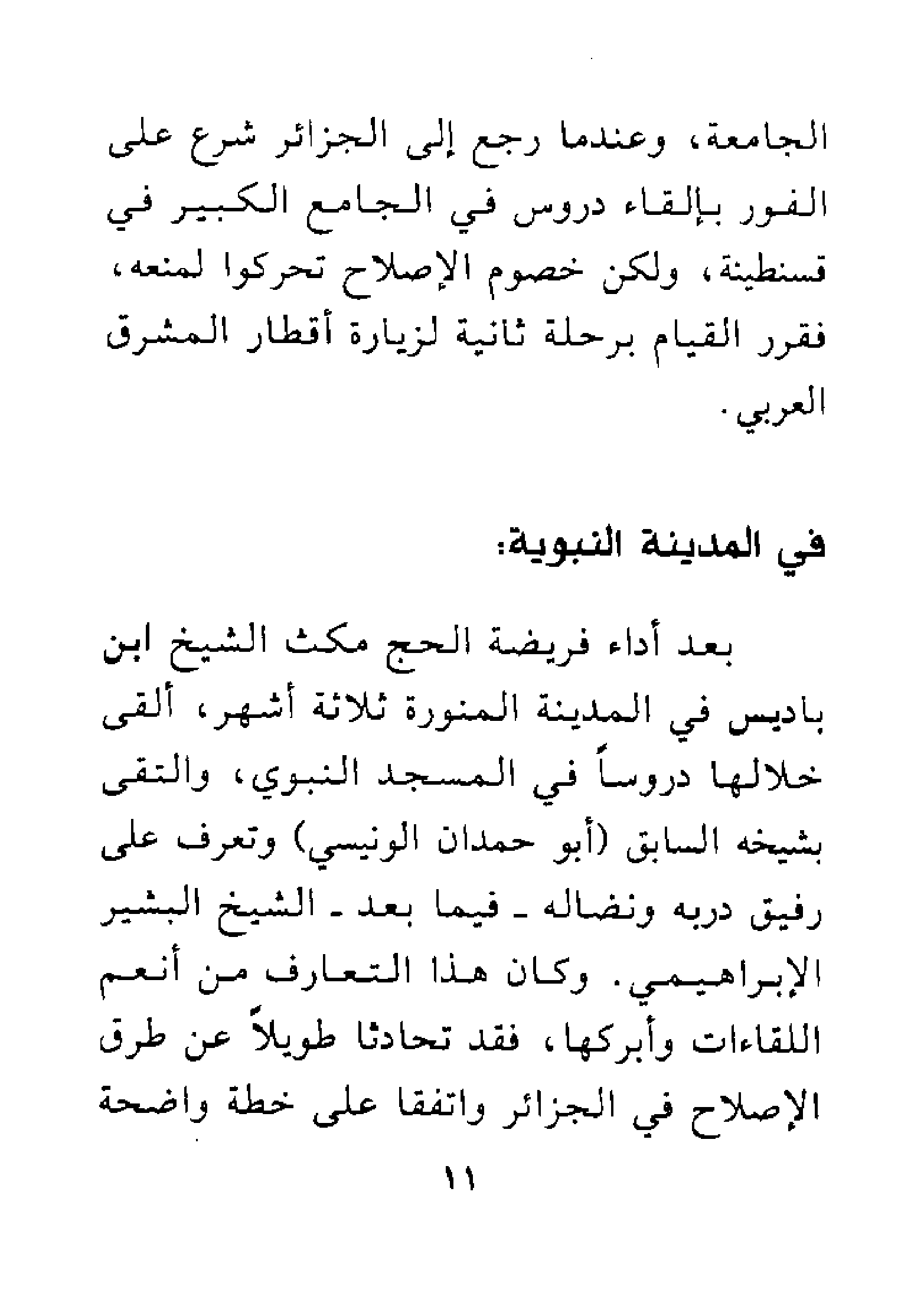 بعد أداء فريضة الحج مكث الشيخ ابن باديس في المدينة المنورة ثلاثة أشهر، ألقى خلالها دروساً في المسجد النبوي، والتقى بشيخه السابق (أبو حمدان الونيسي) وتعرف على رفيق دربه ونضاله- فيما بعد- الشيخ البشير الإبراهيمي. وكان هذا التعارت من أنعم اللقاءات وأبركها، فقد تحادثا طوبلاً عن طرق الإصلاح في الجزائر واتفقا على خطة واضحة