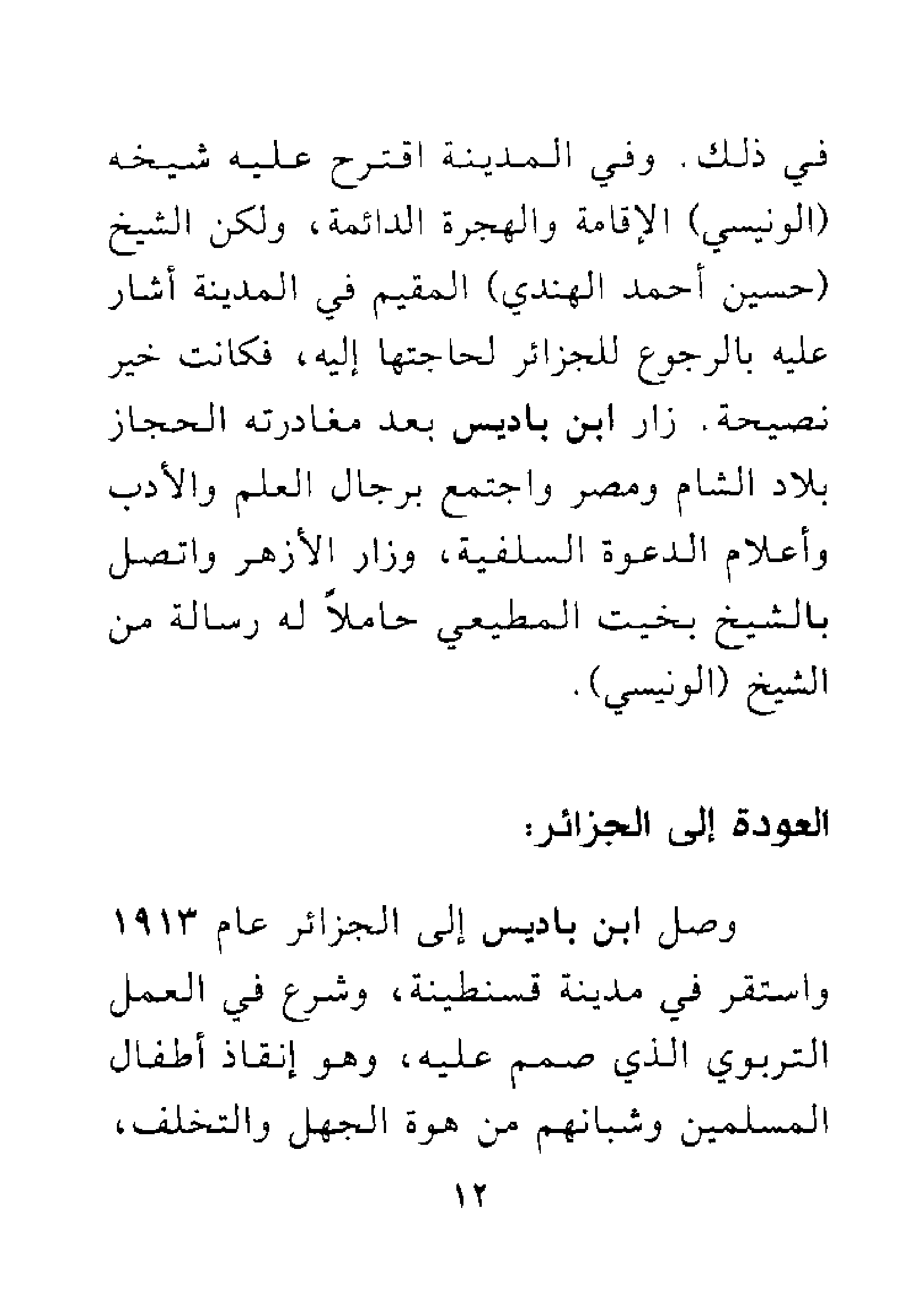 في ذلك. وفي المدينة اقترح عليه شيخه (الونيسي) الإقامة والهجرة الدائمة، ولكن الشيخ (حسين أحمد الهندي) المقيم في المدينة أشار عليه بالرجوع للجزائر لحاجتها إليه، فكانت خير نصيحة. زار ابن بادبس بعد مغادرته الحجاز بلاد الشام ومصر واجتمع برجال العلم والأدب وأعلام الدعوة السلفية، وزار الأزهر واتصل بالشيخ بخيت المطيعي حاملاً له رسالة من الشيخ (الونيسي).