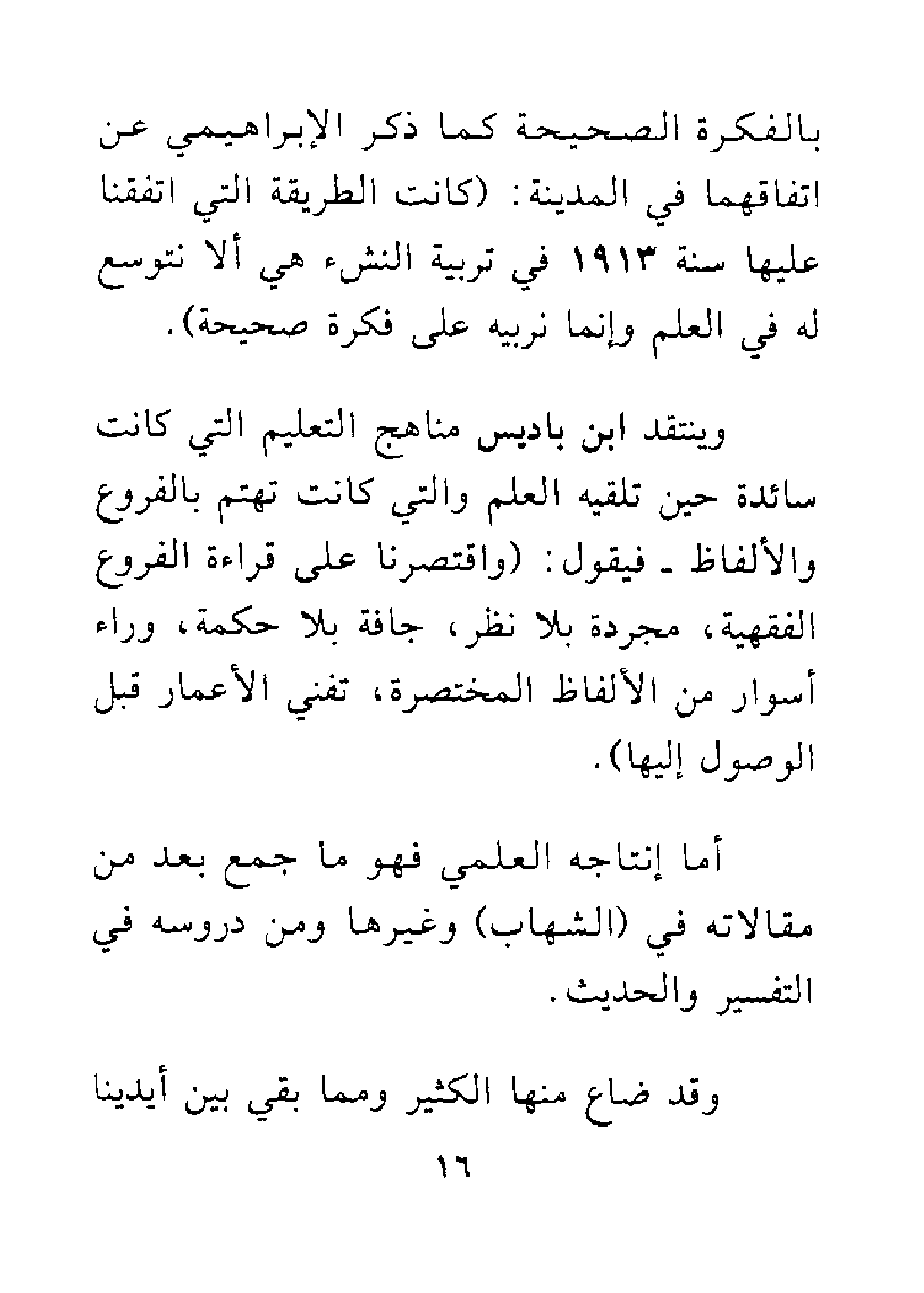بالفكرة الصحيحة كما ذكر الإبراهيمى عن اتفاقهما في المدينة (كانت الطريقة التي اتفقنا عليها سنة 1913 في تربية النشء هي ألا نتوسع له في العلم وإنما نربيه على فكرة صحيحة).