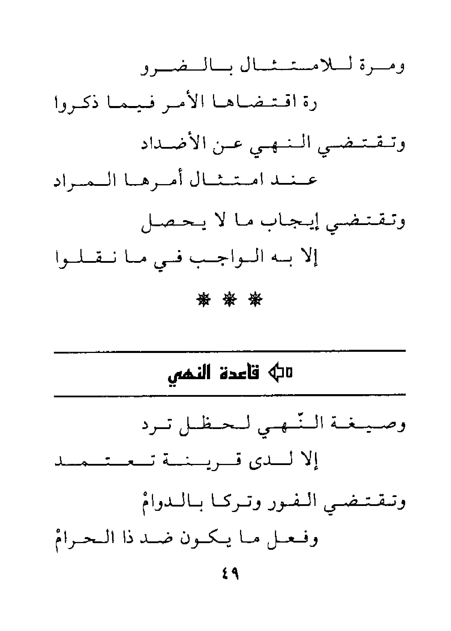 وتقتضي الفور وتركا بالدوامْ … وفعل ما يكون ضد ذا الحرامْ