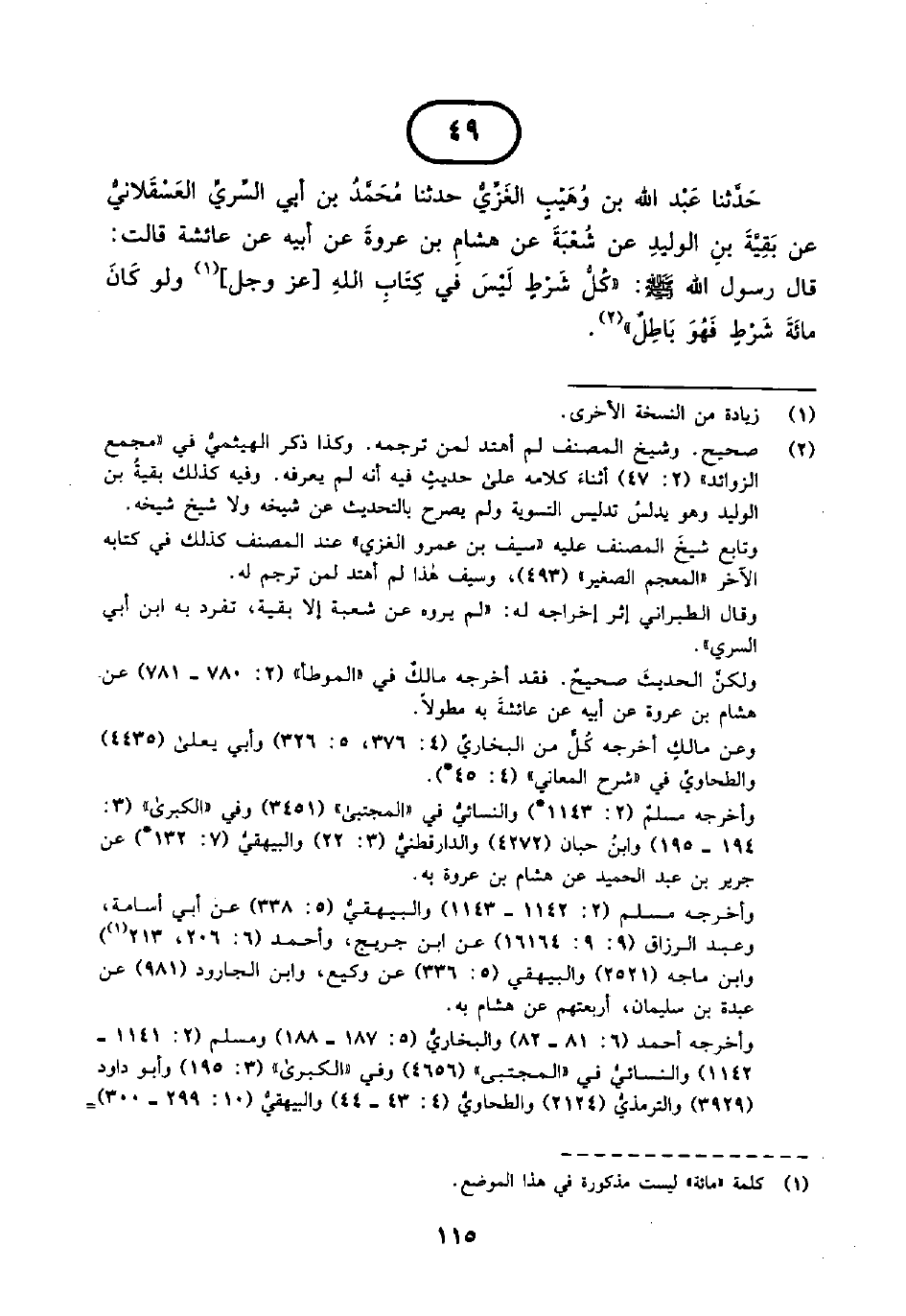 49 - حَدَّثَنَا عَبْدُ اللَّهِ بْنُ وُهَيْبٍ الْغَزِّيُّ حَدَّثَنَا مُحَمَّدُ بْنُ أَبِي السَّرِّيِّ الْعَسْقَلَانِيُّ عَنْ بَقِيَّةِ بْنِ الْوَلِيدِ عَنْ شُعْبَةَ عَنْ هِشَامِ بْنِ عُرْوَةَ عَنْ أَبِيهِ عَنْ عَائِشَةَ قَالَتْ قَالَ رَسُولُ اللَّهِ صَلَّى اللَّهُ عَلَيْهِ وَسَلَّمَ كُلُّ شَرْطٍ لَيْسَ فِي كِتَابِ اللَّهِ [عز وجل] ولو كان مئة شَرْطٍ فَهُوَ بَاطِلٌ.