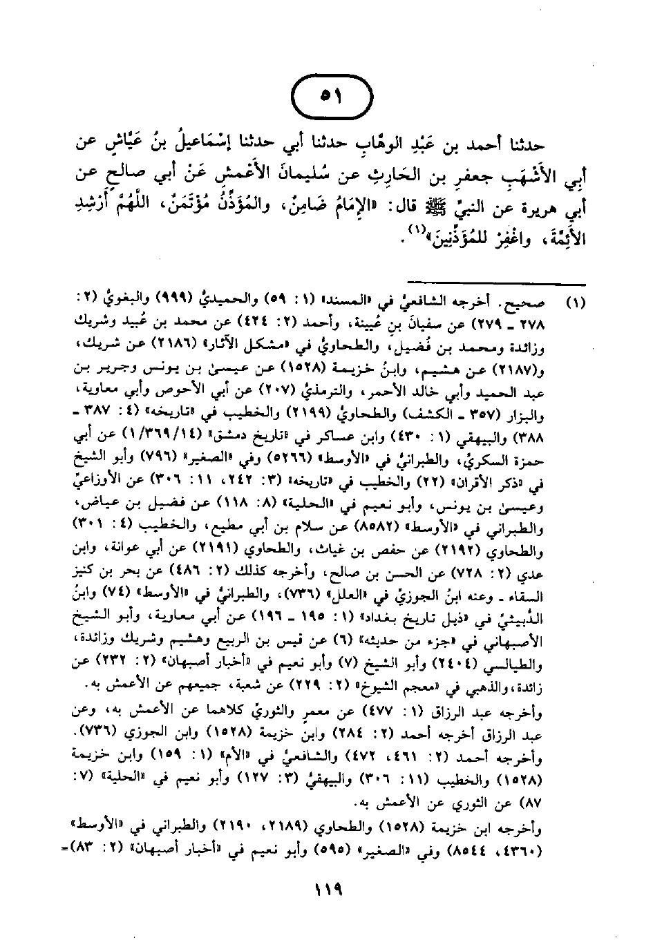 51 - حَدَّثَنَا أَحْمَدُ بْنُ عَبْدِ الْوَهَّابِ حَدَّثَنَا أَبِي حَدَّثَنَا إِسْمَاعِيلُ بْنُ عَيَّاشٍ عَنْ أَبِي الْأَشْهَبِ جَعْفَرِ بْنِ الْحَارِثِ عَنْ سُلَيْمَانَ الْأَعْمَشِ عَنْ أَبِي صَالِحٍ عَنْ أَبِي هُرَيْرَةَ عَنِ النَّبِيِّ صَلَّى اللَّهُ عَلَيْهِ وَسَلَّمَ قَالَ الْإِمَامُ ضَامِنٌ وَالْمُؤَذِّنُ مُؤَتَمَنٌ اللَّهُمَّ أَرْشِدِ الْأَئِمَّةَ وَاغْفِرْ لِلْمُؤَذِّنِينَ.